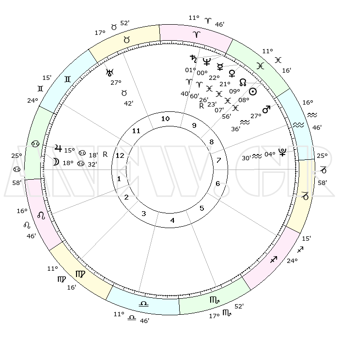 | | ΘΕΣΕΙΣ ΠΛΑΝΗΤΩΝ ΑΣΤΡΟΛΟΓΙΚΟΥ ΧΑΡΤΗ ΤΗΣ ΣΤΙΓΜΗΣ ΑΥΤΗΣ | | | | Πλανήτης | Ζώδιο | Μοίρες | Δεκαήμ. | Σε οίκο | Απόκλιση | | Ακμές των οίκων | | Ηλιος | Ιχθείς | 08°52' | Πρώτο | 9 | 08 S 14 | | 1ος | 07°50' | Καρκίνος | | Σελήνη | Καρκίνος | 17°41' | Δεύτερο | 1 | 26 N 21 | | 2ος | 28°18' | Καρκίνος | | Ερμής | Ιχθείς | 22°27'R | Τρίτο | 10 | 00 S 13 | | 3ος | 20°43' | Λέων | | Αφροδίτη | Ιχθείς | 21°19' | Τρίτο | 10 | 04 S 43 | | 4ος | 18°19' | Παρθένος | | Αρης | Υδροχόος | 27°33' | Τρίτο | 9 | 13 S 21 | | 5ος | 23°22' | Ζυγός | | Δίας | Καρκίνος | 15°18'R | Δεύτερο | 1 | 22 N 54 | | 6ος | 02°35' | Τοξότης | | Κρόνος | Κριός | 01°39' | Πρώτο | 10 | 01 S 18 | | 7ος | 07°50' | Αιγόκερως | | Ουρανός | Ταύρος | 27°42' | Τρίτο | 11 | 19 N 28 | | 8ος | 28°18' | Αιγόκερως | | Ποσειδώνας | Κριός | 00°60' | Πρώτο | 10 | 00 S 48 | | 9ος | 20°43' | Υδροχόος | | Πλούτωνας | Υδροχόος | 04°30' | Πρώτο | 8 | 22 S 53 | | 10ος | 18°19' | Ιχθείς | | Β. Δεσμός | Ιχθείς | 09°08' | Πρώτο | 9 | 08 S 09 | | 11ος | 23°22' | Κριός | | Ωροσκόπος | Καρκίνος | 07°50' | Πρώτο | | | 12ος | 02°35' | Δίδυμοι | | Μεσουράνημα | Ιχθείς | 18°19' | Δεύτερο | | | |
