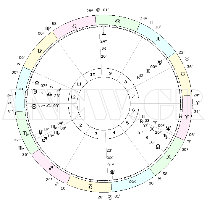 | ΘΕΣΕΙΣ ΠΛΑΝΗΤΩΝ ΑΣΤΡΟΛΟΓΙΚΟΥ ΧΑΡΤΗ ΤΗΣ ΣΤΙΓΜΗΣ ΑΥΤΗΣ | | Πλανήτης | Ζώδιο | Μοίρες | Δεκαήμ. | Σε οίκο | Απόκλιση | | Ακμές των οίκων | Ηλιος | Ζυγός | 26°54' | Τρίτο | 2 | 10 S 22 | | 1ος | 14°16' | Παρθένος | Σελήνη | Ζυγός | 10°44' | Δεύτερο | 2 | 06 S 06 | | 2ος | 09°33' | Ζυγός | Ερμής | Σκορπιός | 18°53' | Δεύτερο | 3 | 19 S 35 | | 3ος | 09°16' | Σκορπιός | Αφροδίτη | Ζυγός | 07°40' | Πρώτο | 1 | 01 S 38 | | 4ος | 12°12' | Τοξότης | Αρης | Σκορπιός | 19°02' | Δεύτερο | 3 | 17 S 44 | | 5ος | 15°36' | Αιγόκερως | Δίας | Καρκίνος | 24°20' | Τρίτο | 11 | 21 N 18 | | 6ος | 16°40' | Υδροχόος | Κρόνος | Ιχθείς | 26°34'R | Τρίτο | 7 | 03 S 39 | | 7ος | 14°16' | Ιχθείς | Ουρανός | Δίδυμοι | 00°42'R | Πρώτο | 9 | 20 N 05 | | 8ος | 09°33' | Κριός | Ποσειδώνας | Κριός | 00°03'R | Πρώτο | 7 | 01 S 14 | | 9ος | 09°16' | Ταύρος | Πλούτωνας | Υδροχόος | 01°23' | Πρώτο | 5 | 23 S 32 | | 10ος | 12°12' | Δίδυμοι | Β. Δεσμός | Ιχθείς | 16°02' | Δεύτερο | 7 | 05 S 30 | | 11ος | 15°36' | Καρκίνος | Ωροσκόπος | Παρθένος | 14°16' | Δεύτερο | | | 12ος | 16°40' | Λέων | Μεσουράνημα | Δίδυμοι | 12°12' | Δεύτερο | | | |