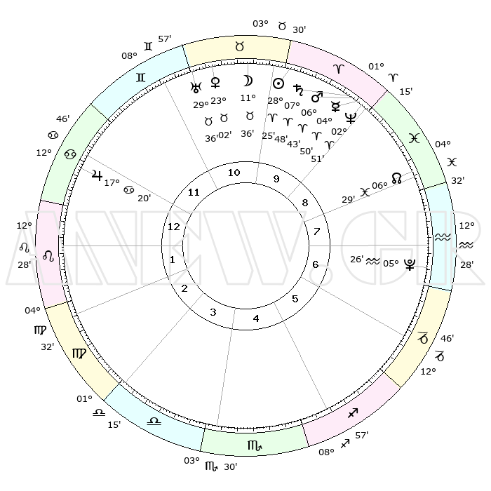 | | ΘΕΣΕΙΣ ΠΛΑΝΗΤΩΝ ΑΣΤΡΟΛΟΓΙΚΟΥ ΧΑΡΤΗ ΤΗΣ ΣΤΙΓΜΗΣ ΑΥΤΗΣ | | | | Πλανήτης | Ζώδιο | Μοίρες | Δεκαήμ. | Σε οίκο | Απόκλιση | | Ακμές των οίκων | | Ηλιος | Κριός | 28°21' | Τρίτο | 10 | 10 N 53 | | 1ος | 22°36' | Καρκίνος | | Σελήνη | Ταύρος | 10°35' | Δεύτερο | 10 | 19 N 18 | | 2ος | 13°14' | Λέων | | Ερμής | Κριός | 04°43' | Πρώτο | 9 | 00 S 33 | | 3ος | 07°18' | Παρθένος | | Αφροδίτη | Ταύρος | 22°57' | Τρίτο | 11 | 18 N 49 | | 4ος | 07°18' | Ζυγός | | Αρης | Κριός | 06°40' | Πρώτο | 9 | 01 N 45 | | 5ος | 13°22' | Σκορπιός | | Δίας | Καρκίνος | 17°20' | Δεύτερο | 12 | 22 N 41 | | 6ος | 20°19' | Τοξότης | | Κρόνος | Κριός | 07°47' | Πρώτο | 10 | 01 N 07 | | 7ος | 22°36' | Αιγόκερως | | Ουρανός | Ταύρος | 29°36' | Τρίτο | 11 | 19 N 54 | | 8ος | 13°14' | Υδροχόος | | Ποσειδώνας | Κριός | 02°51' | Πρώτο | 9 | 00 S 05 | | 9ος | 07°18' | Ιχθείς | | Πλούτωνας | Υδροχόος | 05°26' | Πρώτο | 7 | 22 S 47 | | 10ος | 07°18' | Κριός | | Β. Δεσμός | Ιχθείς | 06°29' | Πρώτο | 8 | 09 S 08 | | 11ος | 13°22' | Ταύρος | | Ωροσκόπος | Καρκίνος | 22°36' | Τρίτο | | | 12ος | 20°20' | Δίδυμοι | | Μεσουράνημα | Κριός | 07°18' | Πρώτο | | | |