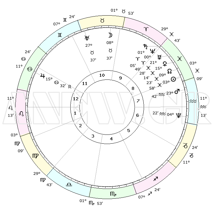 | | ΘΕΣΕΙΣ ΠΛΑΝΗΤΩΝ ΑΣΤΡΟΛΟΓΙΚΟΥ ΧΑΡΤΗ ΤΗΣ ΣΤΙΓΜΗΣ ΑΥΤΗΣ | | | | Πλανήτης | Ζώδιο | Μοίρες | Δεκαήμ. | Σε οίκο | Απόκλιση | | Ακμές των οίκων | | Ηλιος | Ιχθείς | 03°54' | Πρώτο | 8 | 10 S 05 | | 1ος | 20°41' | Καρκίνος | | Σελήνη | Ταύρος | 07°38' | Πρώτο | 10 | 18 N 19 | | 2ος | 11°14' | Λέων | | Ερμής | Ιχθείς | 21°25' | Τρίτο | 9 | 01 S 40 | | 3ος | 05°04' | Παρθένος | | Αφροδίτη | Ιχθείς | 15°09' | Δεύτερο | 9 | 07 S 11 | | 4ος | 04°47' | Ζυγός | | Αρης | Υδροχόος | 23°39' | Τρίτο | 8 | 14 S 40 | | 5ος | 10°48' | Σκορπιός | | Δίας | Καρκίνος | 15°32'R | Δεύτερο | 12 | 22 N 52 | | 6ος | 18°04' | Τοξότης | | Κρόνος | Κριός | 01°05' | Πρώτο | 9 | 01 S 32 | | 7ος | 20°41' | Αιγόκερως | | Ουρανός | Ταύρος | 27°37' | Τρίτο | 11 | 19 N 27 | | 8ος | 11°14' | Υδροχόος | | Ποσειδώνας | Κριός | 00°49' | Πρώτο | 9 | 00 S 52 | | 9ος | 05°04' | Ιχθείς | | Πλούτωνας | Υδροχόος | 04°21' | Πρώτο | 7 | 22 S 54 | | 10ος | 04°47' | Κριός | | Β. Δεσμός | Ιχθείς | 09°23' | Πρώτο | 9 | 08 S 03 | | 11ος | 10°48' | Ταύρος | | Ωροσκόπος | Καρκίνος | 20°41' | Τρίτο | | | 12ος | 18°05' | Δίδυμοι | | Μεσουράνημα | Κριός | 04°47' | Πρώτο | | | |