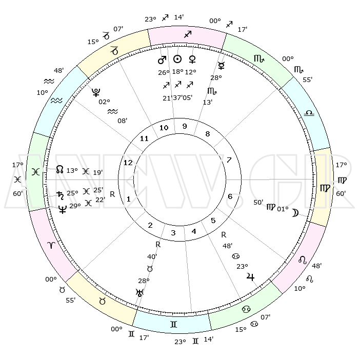 | | ΘΕΣΕΙΣ ΠΛΑΝΗΤΩΝ ΑΣΤΡΟΛΟΓΙΚΟΥ ΧΑΡΤΗ ΤΗΣ ΣΤΙΓΜΗΣ ΑΥΤΗΣ | | | | Πλανήτης | Ζώδιο | Μοίρες | Δεκαήμ. | Σε οίκο | Απόκλιση | | Ακμές των οίκων | | Ηλιος | Τοξότης | 18°35' | Δεύτερο | 10 | 22 S 57 | | 1ος | 29°17' | Υδροχόος | | Σελήνη | Παρθένος | 01°23' | Πρώτο | 7 | 11 N 56 | | 2ος | 14°46' | Κριός | | Ερμής | Σκορπιός | 28°10' | Τρίτο | 9 | 17 S 43 | | 3ος | 17°37' | Ταύρος | | Αφροδίτη | Τοξότης | 12°03' | Δεύτερο | 9 | 21 S 53 | | 4ος | 12°05' | Δίδυμοι | | Αρης | Τοξότης | 26°19' | Τρίτο | 10 | 24 S 07 | | 5ος | 03°47' | Καρκίνος | | Δίας | Καρκίνος | 23°48'R | Τρίτο | 5 | 21 N 31 | | 6ος | 27°16' | Καρκίνος | | Κρόνος | Ιχθείς | 25°25' | Τρίτο | 1 | 03 S 58 | | 7ος | 29°17' | Λέων | | Ουρανός | Ταύρος | 28°40'R | Τρίτο | 3 | 19 N 40 | | 8ος | 14°46' | Ζυγός | | Ποσειδώνας | Ιχθείς | 29°22'R | Τρίτο | 1 | 01 S 29 | | 9ος | 17°37' | Σκορπιός | | Πλούτωνας | Υδροχόος | 02°07' | Πρώτο | 12 | 23 S 21 | | 10ος | 12°05' | Τοξότης | | Β. Δεσμός | Ιχθείς | 13°19' | Δεύτερο | 1 | 06 S 33 | | 11ος | 03°46' | Αιγόκερως | | Ωροσκόπος | Υδροχόος | 29°17' | Τρίτο | | | 12ος | 27°16' | Αιγόκερως | | Μεσουράνημα | Τοξότης | 12°05' | Δεύτερο | | | |