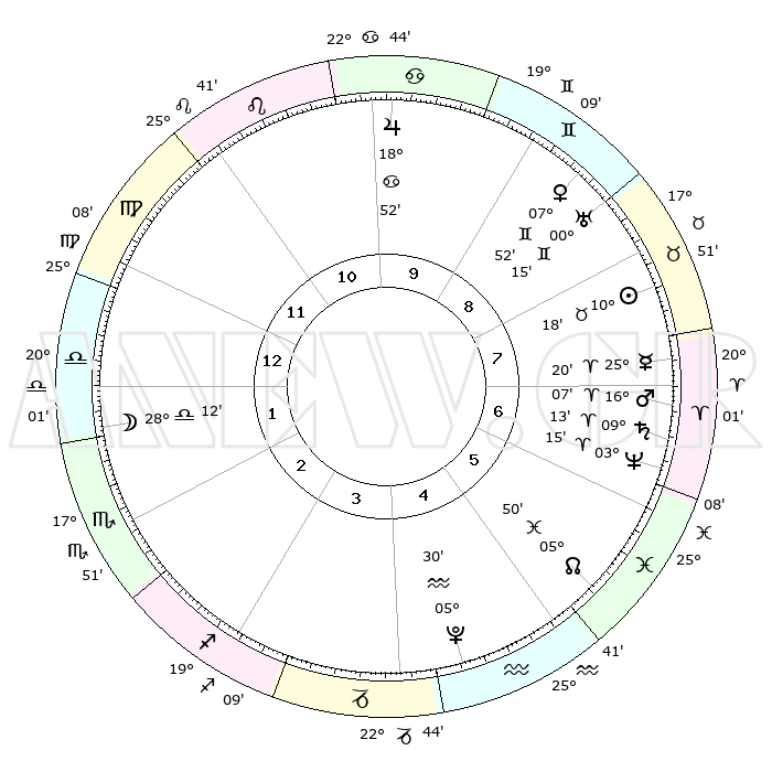 | | ΘΕΣΕΙΣ ΠΛΑΝΗΤΩΝ ΑΣΤΡΟΛΟΓΙΚΟΥ ΧΑΡΤΗ ΤΗΣ ΣΤΙΓΜΗΣ ΑΥΤΗΣ | | | | Πλανήτης | Ζώδιο | Μοίρες | Δεκαήμ. | Σε οίκο | Απόκλιση | | Ακμές των οίκων | | Ηλιος | Ταύρος | 10°15' | Δεύτερο | 8 | 14 N 53 | | 1ος | 03°40' | Ζυγός | | Σελήνη | Ζυγός | 27°31' | Τρίτο | 1 | 14 S 14 | | 2ος | 00°31' | Σκορπιός | | Ερμής | Κριός | 25°13' | Τρίτο | 7 | 07 N 55 | | 3ος | 01°06' | Τοξότης | | Αφροδίτη | Δίδυμοι | 07°48' | Πρώτο | 9 | 22 N 28 | | 4ος | 04°08' | Αιγόκερως | | Αρης | Κριός | 16°04' | Δεύτερο | 7 | 05 N 30 | | 5ος | 07°04' | Υδροχόος | | Δίας | Καρκίνος | 18°52' | Δεύτερο | 10 | 22 N 30 | | 6ος | 07°22' | Ιχθείς | | Κρόνος | Κριός | 09°13' | Πρώτο | 7 | 01 N 39 | | 7ος | 03°40' | Κριός | | Ουρανός | Δίδυμοι | 00°15' | Πρώτο | 8 | 20 N 02 | | 8ος | 00°31' | Ταύρος | | Ποσειδώνας | Κριός | 03°15' | Πρώτο | 6 | 00 N 05 | | 9ος | 01°06' | Δίδυμοι | | Πλούτωνας | Υδροχόος | 05°30' | Πρώτο | 4 | 22 S 49 | | 10ος | 04°08' | Καρκίνος | | Β. Δεσμός | Ιχθείς | 05°50' | Πρώτο | 5 | 09 S 22 | | 11ος | 07°04' | Λέων | | Ωροσκόπος | Ζυγός | 03°40' | Πρώτο | | | 12ος | 07°22' | Παρθένος | | Μεσουράνημα | Καρκίνος | 04°08' | Πρώτο | | | |