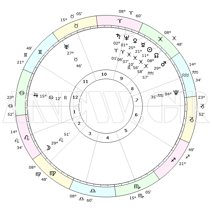 | | ΘΕΣΕΙΣ ΠΛΑΝΗΤΩΝ ΑΣΤΡΟΛΟΓΙΚΟΥ ΧΑΡΤΗ ΤΗΣ ΣΤΙΓΜΗΣ ΑΥΤΗΣ | | | | Πλανήτης | Ζώδιο | Μοίρες | Δεκαήμ. | Σε οίκο | Απόκλιση | | Ακμές των οίκων | | Ηλιος | Ιχθείς | 11°52' | Δεύτερο | 9 | 07 S 07 | | 1ος | 03°34' | Καρκίνος | | Σελήνη | Λέων | 28°57' | Τρίτο | 3 | 12 N 42 | | 2ος | 24°11' | Καρκίνος | | Ερμής | Ιχθείς | 21°12'R | Τρίτο | 10 | 00 S 16 | | 3ος | 16°14' | Λέων | | Αφροδίτη | Ιχθείς | 25°02' | Τρίτο | 10 | 03 S 12 | | 4ος | 13°08' | Παρθένος | | Αρης | Υδροχόος | 29°54' | Τρίτο | 9 | 12 S 32 | | 5ος | 17°36' | Ζυγός | | Δίας | Καρκίνος | 15°12'R | Δεύτερο | 1 | 22 N 55 | | 6ος | 27°18' | Σκορπιός | | Κρόνος | Κριός | 02°01' | Πρώτο | 10 | 01 S 09 | | 7ος | 03°34' | Αιγόκερως | | Ουρανός | Ταύρος | 27°46' | Τρίτο | 12 | 19 N 29 | | 8ος | 24°11' | Αιγόκερως | | Ποσειδώνας | Κριός | 01°06' | Πρώτο | 10 | 00 S 46 | | 9ος | 16°14' | Υδροχόος | | Πλούτωνας | Υδροχόος | 04°34' | Πρώτο | 8 | 22 S 52 | | 10ος | 13°08' | Ιχθείς | | Β. Δεσμός | Ιχθείς | 08°58' | Πρώτο | 9 | 08 S 12 | | 11ος | 17°36' | Κριός | | Ωροσκόπος | Καρκίνος | 03°34' | Πρώτο | | | 12ος | 27°18' | Ταύρος | | Μεσουράνημα | Ιχθείς | 13°08' | Δεύτερο | | | |