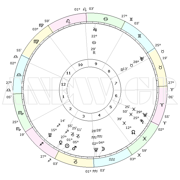 | | ΘΕΣΕΙΣ ΠΛΑΝΗΤΩΝ ΑΣΤΡΟΛΟΓΙΚΟΥ ΧΑΡΤΗ ΤΗΣ ΣΤΙΓΜΗΣ ΑΥΤΗΣ | | | | Πλανήτης | Ζώδιο | Μοίρες | Δεκαήμ. | Σε οίκο | Απόκλιση | | Ακμές των οίκων | | Ηλιος | Αιγόκερως | 01°20' | Πρώτο | 3 | 23 S 26 | | 1ος | 01°23' | Ζυγός | | Σελήνη | Υδροχόος | 03°23' | Πρώτο | 4 | 22 S 25 | | 2ος | 28°04' | Ζυγός | | Ερμής | Τοξότης | 15°06' | Δεύτερο | 3 | 22 S 05 | | 3ος | 28°33' | Σκορπιός | | Αφροδίτη | Τοξότης | 27°48' | Τρίτο | 3 | 23 S 34 | | 4ος | 01°33' | Αιγόκερως | | Αρης | Αιγόκερως | 05°47' | Πρώτο | 4 | 24 S 08 | | 5ος | 04°31' | Υδροχόος | | Δίας | Καρκίνος | 22°29'R | Τρίτο | 10 | 21 N 46 | | 6ος | 04°53' | Ιχθείς | | Κρόνος | Ιχθείς | 25°49' | Τρίτο | 6 | 03 S 46 | | 7ος | 01°23' | Κριός | | Ουρανός | Ταύρος | 28°13'R | Τρίτο | 8 | 19 N 34 | | 8ος | 28°04' | Κριός | | Ποσειδώνας | Ιχθείς | 29°25' | Τρίτο | 6 | 01 S 28 | | 9ος | 28°33' | Ταύρος | | Πλούτωνας | Υδροχόος | 02°27' | Πρώτο | 4 | 23 S 17 | | 10ος | 01°33' | Καρκίνος | | Β. Δεσμός | Ιχθείς | 12°39' | Δεύτερο | 6 | 06 S 49 | | 11ος | 04°31' | Λέων | | Ωροσκόπος | Ζυγός | 01°23' | Πρώτο | | | 12ος | 04°53' | Παρθένος | | Μεσουράνημα | Καρκίνος | 01°33' | Πρώτο | | | |