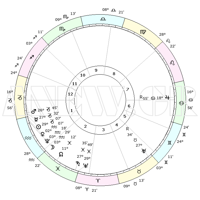 | | ΘΕΣΕΙΣ ΠΛΑΝΗΤΩΝ ΑΣΤΡΟΛΟΓΙΚΟΥ ΧΑΡΤΗ ΤΗΣ ΣΤΙΓΜΗΣ ΑΥΤΗΣ | | | | Πλανήτης | Ζώδιο | Μοίρες | Δεκαήμ. | Σε οίκο | Απόκλιση | | Ακμές των οίκων | | Ηλιος | Αιγόκερως | 29°03' | Τρίτο | 1 | 20 S 21 | | 1ος | 23°30' | Τοξότης | | Σελήνη | Υδροχόος | 02°38' | Πρώτο | 2 | 22 S 35 | | 2ος | 29°03' | Αιγόκερως | | Ερμής | Αιγόκερως | 27°25' | Τρίτο | 1 | 22 S 37 | | 3ος | 08°26' | Ιχθείς | | Αφροδίτη | Υδροχόος | 02°02' | Πρώτο | 2 | 20 S 46 | | 4ος | 13°19' | Κριός | | Αρης | Αιγόκερως | 26°42' | Τρίτο | 1 | 21 S 47 | | 5ος | 10°42' | Ταύρος | | Δίας | Καρκίνος | 18°56'R | Δεύτερο | 7 | 22 N 22 | | 6ος | 02°60' | Δίδυμοι | | Κρόνος | Ιχθείς | 27°35' | Τρίτο | 3 | 02 S 59 | | 7ος | 23°30' | Δίδυμοι | | Ουρανός | Ταύρος | 27°34'R | Τρίτο | 5 | 19 N 25 | | 8ος | 29°03' | Καρκίνος | | Ποσειδώνας | Ιχθείς | 29°49' | Τρίτο | 3 | 01 S 17 | | 9ος | 08°26' | Παρθένος | | Πλούτωνας | Υδροχόος | 03°17' | Πρώτο | 2 | 23 S 06 | | 10ος | 13°19' | Ζυγός | | Β. Δεσμός | Ιχθείς | 11°13' | Δεύτερο | 3 | 07 S 22 | | 11ος | 10°42' | Σκορπιός | | Ωροσκόπος | Τοξότης | 23°30' | Τρίτο | | | 12ος | 02°60' | Τοξότης | | Μεσουράνημα | Ζυγός | 13°19' | Δεύτερο | | | |