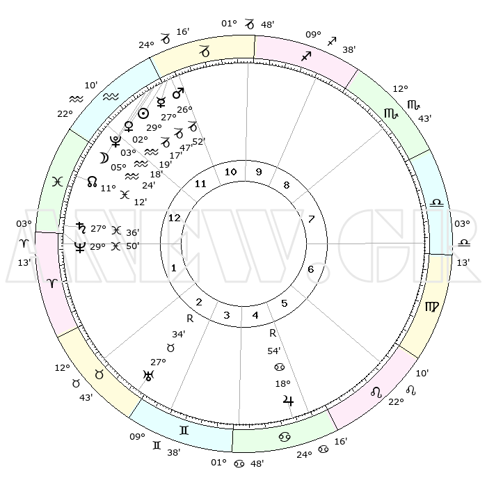 | | ΘΕΣΕΙΣ ΠΛΑΝΗΤΩΝ ΑΣΤΡΟΛΟΓΙΚΟΥ ΧΑΡΤΗ ΤΗΣ ΣΤΙΓΜΗΣ ΑΥΤΗΣ | | | | Πλανήτης | Ζώδιο | Μοίρες | Δεκαήμ. | Σε οίκο | Απόκλιση | | Ακμές των οίκων | | Ηλιος | Αιγόκερως | 29°12' | Τρίτο | 12 | 20 S 19 | | 1ος | 23°10' | Υδροχόος | | Σελήνη | Υδροχόος | 04°31' | Πρώτο | 12 | 22 S 00 | | 2ος | 08°57' | Κριός | | Ερμής | Αιγόκερως | 27°40' | Τρίτο | 12 | 22 S 34 | | 3ος | 13°02' | Ταύρος | | Αφροδίτη | Υδροχόος | 02°13' | Πρώτο | 12 | 20 S 44 | | 4ος | 08°09' | Δίδυμοι | | Αρης | Αιγόκερως | 26°49' | Τρίτο | 12 | 21 S 46 | | 5ος | 29°55' | Δίδυμοι | | Δίας | Καρκίνος | 18°55'R | Δεύτερο | 5 | 22 N 23 | | 6ος | 22°49' | Καρκίνος | | Κρόνος | Ιχθείς | 27°36' | Τρίτο | 1 | 02 S 59 | | 7ος | 23°10' | Λέων | | Ουρανός | Ταύρος | 27°34'R | Τρίτο | 3 | 19 N 25 | | 8ος | 08°57' | Ζυγός | | Ποσειδώνας | Ιχθείς | 29°50' | Τρίτο | 1 | 01 S 17 | | 9ος | 13°02' | Σκορπιός | | Πλούτωνας | Υδροχόος | 03°18' | Πρώτο | 12 | 23 S 06 | | 10ος | 08°09' | Τοξότης | | Β. Δεσμός | Ιχθείς | 11°12' | Δεύτερο | 1 | 07 S 22 | | 11ος | 29°55' | Τοξότης | | Ωροσκόπος | Υδροχόος | 23°10' | Τρίτο | | | 12ος | 22°49' | Αιγόκερως | | Μεσουράνημα | Τοξότης | 08°09' | Πρώτο | | | |