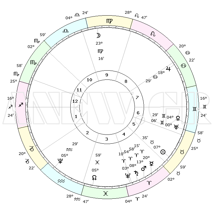 | | ΘΕΣΕΙΣ ΠΛΑΝΗΤΩΝ ΑΣΤΡΟΛΟΓΙΚΟΥ ΧΑΡΤΗ ΤΗΣ ΣΤΙΓΜΗΣ ΑΥΤΗΣ | | | | Πλανήτης | Ζώδιο | Μοίρες | Δεκαήμ. | Σε οίκο | Απόκλιση | | Ακμές των οίκων | | Ηλιος | Ταύρος | 07°32' | Πρώτο | 6 | 14 N 01 | | 1ος | 28°36' | Σκορπιός | | Σελήνη | Παρθένος | 22°31' | Τρίτο | 10 | 01 N 45 | | 2ος | 29°32' | Τοξότης | | Ερμής | Κριός | 20°08' | Τρίτο | 5 | 05 N 48 | | 3ος | 05°00' | Υδροχόος | | Αφροδίτη | Δίδυμοι | 04°24' | Πρώτο | 7 | 21 N 46 | | 4ος | 11°01' | Ιχθείς | | Αρης | Κριός | 13°55' | Δεύτερο | 5 | 04 N 39 | | 5ος | 12°13' | Κριός | | Δίας | Καρκίνος | 18°29' | Δεύτερο | 8 | 22 N 33 | | 6ος | 07°28' | Ταύρος | | Κρόνος | Κριός | 08°54' | Πρώτο | 4 | 01 N 32 | | 7ος | 28°36' | Ταύρος | | Ουρανός | Δίδυμοι | 00°06' | Πρώτο | 7 | 20 N 00 | | 8ος | 29°32' | Δίδυμοι | | Ποσειδώνας | Κριός | 03°10' | Πρώτο | 4 | 00 N 03 | | 9ος | 05°00' | Λέων | | Πλούτωνας | Υδροχόος | 05°29' | Πρώτο | 3 | 22 S 48 | | 10ος | 11°01' | Παρθένος | | Β. Δεσμός | Ιχθείς | 05°59' | Πρώτο | 3 | 09 S 19 | | 11ος | 12°13' | Ζυγός | | Ωροσκόπος | Σκορπιός | 28°36' | Τρίτο | | | 12ος | 07°28' | Σκορπιός | | Μεσουράνημα | Παρθένος | 11°01' | Δεύτερο | | | |