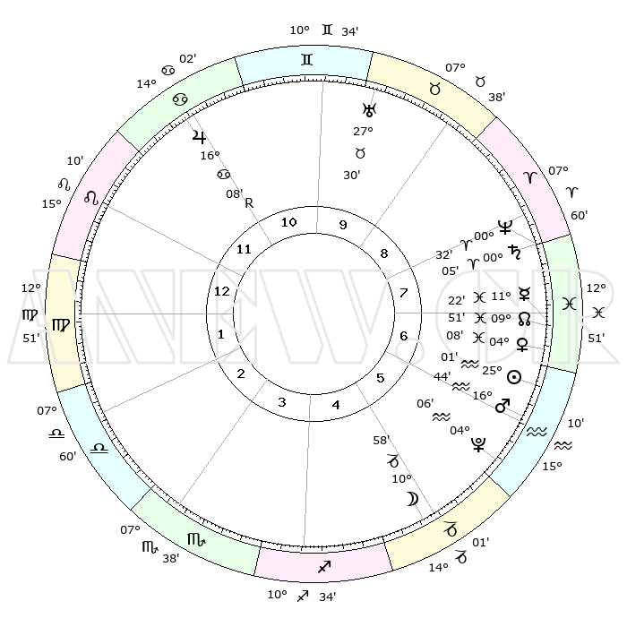 | | ΘΕΣΕΙΣ ΠΛΑΝΗΤΩΝ ΑΣΤΡΟΛΟΓΙΚΟΥ ΧΑΡΤΗ ΤΗΣ ΣΤΙΓΜΗΣ ΑΥΤΗΣ | | | | Πλανήτης | Ζώδιο | Μοίρες | Δεκαήμ. | Σε οίκο | Απόκλιση | | Ακμές των οίκων | | Ηλιος | Υδροχόος | 24°57' | Τρίτο | 7 | 13 S 12 | | 1ος | 19°47' | Λέων | | Σελήνη | Αιγόκερως | 09°60' | Πρώτο | 5 | 27 S 33 | | 2ος | 12°34' | Παρθένος | | Ερμής | Ιχθείς | 11°14' | Δεύτερο | 7 | 07 S 34 | | 3ος | 10°11' | Ζυγός | | Αφροδίτη | Ιχθείς | 04°02' | Πρώτο | 7 | 11 S 23 | | 4ος | 12°50' | Σκορπιός | | Αρης | Υδροχόος | 16°40' | Δεύτερο | 6 | 16 S 52 | | 5ος | 17°46' | Τοξότης | | Δίας | Καρκίνος | 16°08'R | Δεύτερο | 11 | 22 N 47 | | 6ος | 20°41' | Αιγόκερως | | Κρόνος | Κριός | 00°05' | Πρώτο | 8 | 01 S 57 | | 7ος | 19°47' | Υδροχόος | | Ουρανός | Ταύρος | 27°30' | Τρίτο | 10 | 19 N 25 | | 8ος | 12°34' | Ιχθείς | | Ποσειδώνας | Κριός | 00°31' | Πρώτο | 8 | 01 S 00 | | 9ος | 10°11' | Κριός | | Πλούτωνας | Υδροχόος | 04°06' | Πρώτο | 6 | 22 S 57 | | 10ος | 12°50' | Ταύρος | | Β. Δεσμός | Ιχθείς | 09°51' | Πρώτο | 7 | 07 S 52 | | 11ος | 17°46' | Δίδυμοι | | Ωροσκόπος | Λέων | 19°47' | Δεύτερο | | | 12ος | 20°41' | Καρκίνος | | Μεσουράνημα | Ταύρος | 12°50' | Δεύτερο | | | |