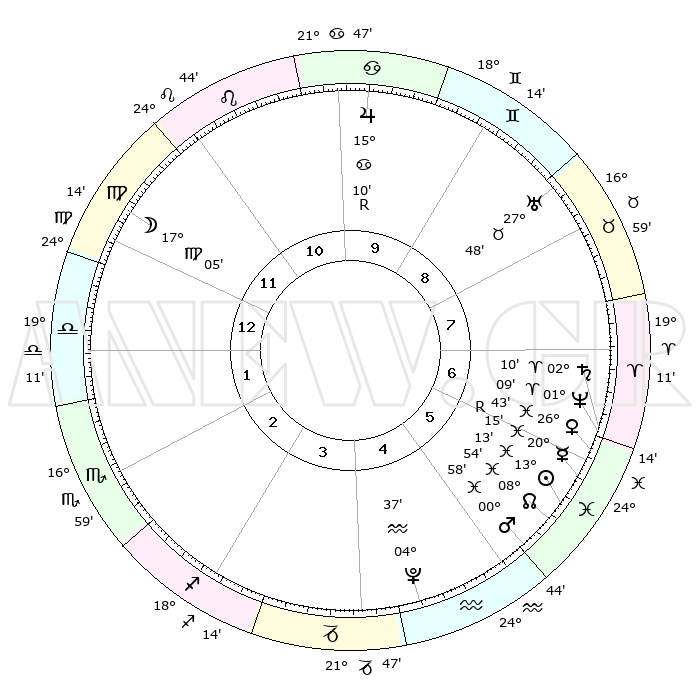 | | ΘΕΣΕΙΣ ΠΛΑΝΗΤΩΝ ΑΣΤΡΟΛΟΓΙΚΟΥ ΧΑΡΤΗ ΤΗΣ ΣΤΙΓΜΗΣ ΑΥΤΗΣ | | | | Πλανήτης | Ζώδιο | Μοίρες | Δεκαήμ. | Σε οίκο | Απόκλιση | | Ακμές των οίκων | | Ηλιος | Ιχθείς | 13°10' | Δεύτερο | 6 | 06 S 37 | | 1ος | 02°51' | Ζυγός | | Σελήνη | Παρθένος | 16°21' | Δεύτερο | 12 | 04 N 45 | | 2ος | 29°38' | Ζυγός | | Ερμής | Ιχθείς | 20°17'R | Τρίτο | 6 | 00 S 31 | | 3ος | 00°11' | Τοξότης | | Αφροδίτη | Ιχθείς | 26°39' | Τρίτο | 6 | 02 S 32 | | 4ος | 03°12' | Αιγόκερως | | Αρης | Ιχθείς | 00°55' | Πρώτο | 5 | 12 S 10 | | 5ος | 06°09' | Υδροχόος | | Δίας | Καρκίνος | 15°10'R | Δεύτερο | 10 | 22 N 55 | | 6ος | 06°28' | Ιχθείς | | Κρόνος | Κριός | 02°10' | Πρώτο | 6 | 01 S 06 | | 7ος | 02°51' | Κριός | | Ουρανός | Ταύρος | 27°48' | Τρίτο | 8 | 19 N 29 | | 8ος | 29°38' | Κριός | | Ποσειδώνας | Κριός | 01°09' | Πρώτο | 6 | 00 S 45 | | 9ος | 00°11' | Δίδυμοι | | Πλούτωνας | Υδροχόος | 04°37' | Πρώτο | 4 | 22 S 52 | | 10ος | 03°12' | Καρκίνος | | Β. Δεσμός | Ιχθείς | 08°54' | Πρώτο | 6 | 08 S 14 | | 11ος | 06°09' | Λέων | | Ωροσκόπος | Ζυγός | 02°51' | Πρώτο | | | 12ος | 06°28' | Παρθένος | | Μεσουράνημα | Καρκίνος | 03°12' | Πρώτο | | | |