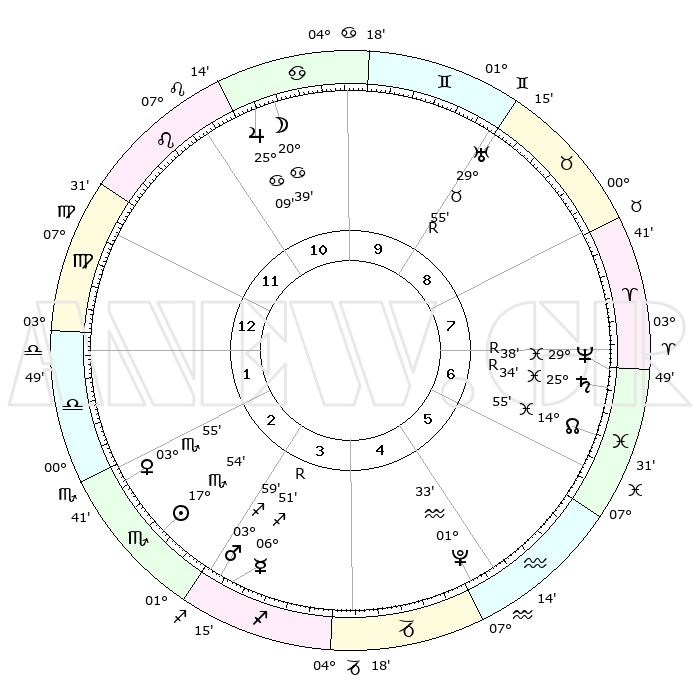 | | ΘΕΣΕΙΣ ΠΛΑΝΗΤΩΝ ΑΣΤΡΟΛΟΓΙΚΟΥ ΧΑΡΤΗ ΤΗΣ ΣΤΙΓΜΗΣ ΑΥΤΗΣ | | | | Πλανήτης | Ζώδιο | Μοίρες | Δεκαήμ. | Σε οίκο | Απόκλιση | | Ακμές των οίκων | | Ηλιος | Σκορπιός | 17°50' | Δεύτερο | 3 | 17 S 09 | | 1ος | 12°21' | Παρθένος | | Σελήνη | Καρκίνος | 19°37' | Δεύτερο | 11 | 26 N 12 | | 2ος | 07°27' | Ζυγός | | Ερμής | Τοξότης | 06°52'R | Πρώτο | 3 | 23 S 44 | | 3ος | 07°03' | Σκορπιός | | Αφροδίτη | Σκορπιός | 03°49' | Πρώτο | 2 | 11 S 33 | | 4ος | 09°60' | Τοξότης | | Αρης | Τοξότης | 03°55' | Πρώτο | 3 | 21 S 24 | | 5ος | 13°28' | Αιγόκερως | | Δίας | Καρκίνος | 25°09' | Τρίτο | 11 | 21 N 12 | | 6ος | 14°38' | Υδροχόος | | Κρόνος | Ιχθείς | 25°35'R | Τρίτο | 7 | 04 S 00 | | 7ος | 12°21' | Ιχθείς | | Ουρανός | Ταύρος | 29°55'R | Τρίτο | 9 | 19 N 55 | | 8ος | 07°27' | Κριός | | Ποσειδώνας | Ιχθείς | 29°38'R | Τρίτο | 7 | 01 S 24 | | 9ος | 07°03' | Ταύρος | | Πλούτωνας | Υδροχόος | 01°32' | Πρώτο | 5 | 23 S 29 | | 10ος | 09°60' | Δίδυμοι | | Β. Δεσμός | Ιχθείς | 14°55' | Δεύτερο | 7 | 05 S 56 | | 11ος | 13°28' | Καρκίνος | | Ωροσκόπος | Παρθένος | 12°21' | Δεύτερο | | | 12ος | 14°38' | Λέων | | Μεσουράνημα | Δίδυμοι | 09°60' | Πρώτο | | | |
