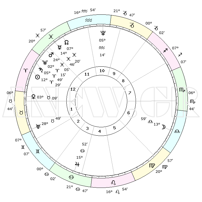 | | ΘΕΣΕΙΣ ΠΛΑΝΗΤΩΝ ΑΣΤΡΟΛΟΓΙΚΟΥ ΧΑΡΤΗ ΤΗΣ ΣΤΙΓΜΗΣ ΑΥΤΗΣ | | | | Πλανήτης | Ζώδιο | Μοίρες | Δεκαήμ. | Σε οίκο | Απόκλιση | | Ακμές των οίκων | | Ηλιος | Κριός | 12°26' | Δεύτερο | 1 | 04 N 55 | | 1ος | 05°16' | Κριός | | Σελήνη | Ζυγός | 13°16' | Δεύτερο | 7 | 07 S 57 | | 2ος | 14°15' | Ταύρος | | Ερμής | Ιχθείς | 14°43' | Δεύτερο | 12 | 07 S 23 | | 3ος | 10°52' | Δίδυμοι | | Αφροδίτη | Ταύρος | 03°05' | Πρώτο | 1 | 12 N 10 | | 4ος | 02°58' | Καρκίνος | | Αρης | Ιχθείς | 24°02' | Τρίτο | 12 | 03 S 19 | | 5ος | 25°31' | Καρκίνος | | Δίας | Καρκίνος | 15°52' | Δεύτερο | 4 | 22 N 52 | | 6ος | 23°45' | Λέων | | Κρόνος | Κριός | 05°48' | Πρώτο | 1 | 00 N 21 | | 7ος | 05°16' | Ζυγός | | Ουρανός | Ταύρος | 28°49' | Τρίτο | 2 | 19 N 43 | | 8ος | 14°15' | Σκορπιός | | Ποσειδώνας | Κριός | 02°15' | Πρώτο | 12 | 00 S 18 | | 9ος | 10°52' | Τοξότης | | Πλούτωνας | Υδροχόος | 05°14' | Πρώτο | 11 | 22 S 47 | | 10ος | 02°58' | Αιγόκερως | | Β. Δεσμός | Ιχθείς | 07°21' | Πρώτο | 12 | 08 S 49 | | 11ος | 25°31' | Αιγόκερως | | Ωροσκόπος | Κριός | 05°16' | Πρώτο | | | 12ος | 23°45' | Υδροχόος | | Μεσουράνημα | Αιγόκερως | 02°58' | Πρώτο | | | |