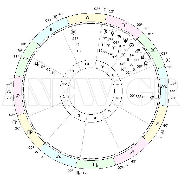 | | ΘΕΣΕΙΣ ΠΛΑΝΗΤΩΝ ΑΣΤΡΟΛΟΓΙΚΟΥ ΧΑΡΤΗ ΤΗΣ ΣΤΙΓΜΗΣ ΑΥΤΗΣ | | | | Πλανήτης | Ζώδιο | Μοίρες | Δεκαήμ. | Σε οίκο | Απόκλιση | | Ακμές των οίκων | | Ηλιος | Ιχθείς | 29°50' | Τρίτο | 9 | 00 S 04 | | 1ος | 19°54' | Καρκίνος | | Σελήνη | Κριός | 18°09' | Δεύτερο | 10 | 10 N 11 | | 2ος | 10°26' | Λέων | | Ερμής | Ιχθείς | 08°30'R | Πρώτο | 9 | 07 S 23 | | 3ος | 04°09' | Παρθένος | | Αφροδίτη | Κριός | 17°23' | Δεύτερο | 10 | 06 N 01 | | 4ος | 03°45' | Ζυγός | | Αρης | Ιχθείς | 14°04' | Δεύτερο | 9 | 07 S 16 | | 5ος | 09°44' | Σκορπιός | | Δίας | Καρκίνος | 15°14' | Δεύτερο | 12 | 22 N 55 | | 6ος | 17°09' | Τοξότης | | Κρόνος | Κριός | 04°13' | Πρώτο | 10 | 00 S 16 | | 7ος | 19°54' | Αιγόκερως | | Ουρανός | Ταύρος | 28°18' | Τρίτο | 11 | 19 N 36 | | 8ος | 10°26' | Υδροχόος | | Ποσειδώνας | Κριός | 01°46' | Πρώτο | 9 | 00 S 30 | | 9ος | 04°09' | Ιχθείς | | Πλούτωνας | Υδροχόος | 05°00' | Πρώτο | 7 | 22 S 49 | | 10ος | 03°45' | Κριός | | Β. Δεσμός | Ιχθείς | 08°01' | Πρώτο | 9 | 08 S 34 | | 11ος | 09°44' | Ταύρος | | Ωροσκόπος | Καρκίνος | 19°54' | Δεύτερο | | | 12ος | 17°09' | Δίδυμοι | | Μεσουράνημα | Κριός | 03°45' | Πρώτο | | | |