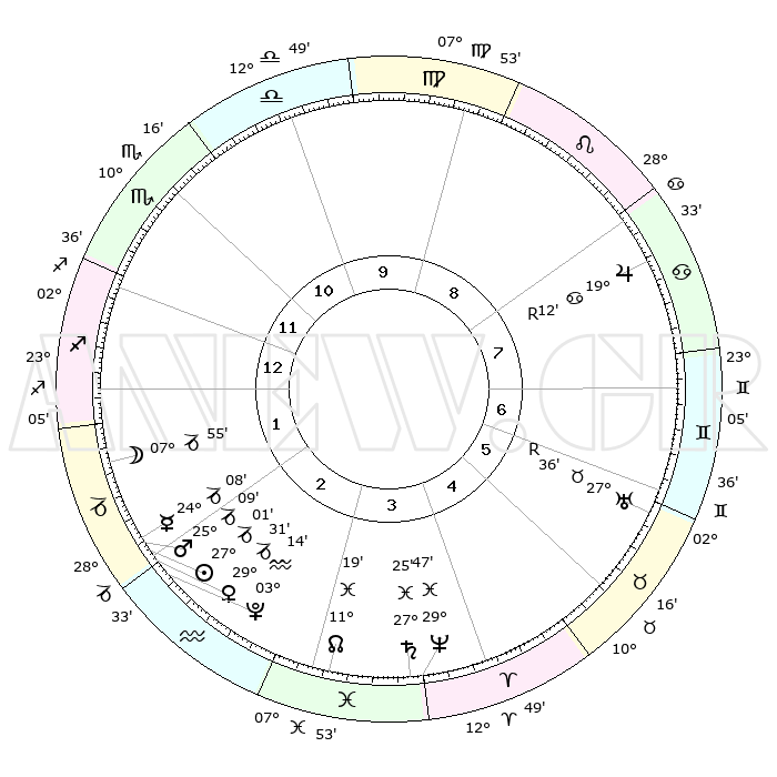 | | ΘΕΣΕΙΣ ΠΛΑΝΗΤΩΝ ΑΣΤΡΟΛΟΓΙΚΟΥ ΧΑΡΤΗ ΤΗΣ ΣΤΙΓΜΗΣ ΑΥΤΗΣ | | | | Πλανήτης | Ζώδιο | Μοίρες | Δεκαήμ. | Σε οίκο | Απόκλιση | | Ακμές των οίκων | | Ηλιος | Αιγόκερως | 26°57' | Τρίτο | 2 | 20 S 46 | | 1ος | 04°17' | Τοξότης | | Σελήνη | Αιγόκερως | 07°10' | Πρώτο | 2 | 27 S 47 | | 2ος | 06°02' | Αιγόκερως | | Ερμής | Αιγόκερως | 24°02' | Τρίτο | 2 | 23 S 10 | | 3ος | 12°27' | Υδροχόος | | Αφροδίτη | Αιγόκερως | 29°27' | Τρίτο | 2 | 21 S 17 | | 4ος | 18°33' | Ιχθείς | | Αρης | Αιγόκερως | 25°06' | Τρίτο | 2 | 22 S 04 | | 5ος | 19°01' | Κριός | | Δίας | Καρκίνος | 19°12'R | Δεύτερο | 8 | 22 N 20 | | 6ος | 13°30' | Ταύρος | | Κρόνος | Ιχθείς | 27°25' | Τρίτο | 4 | 03 S 03 | | 7ος | 04°17' | Δίδυμοι | | Ουρανός | Ταύρος | 27°36'R | Τρίτο | 6 | 19 N 26 | | 8ος | 06°02' | Καρκίνος | | Ποσειδώνας | Ιχθείς | 29°47' | Τρίτο | 4 | 01 S 18 | | 9ος | 12°27' | Λέων | | Πλούτωνας | Υδροχόος | 03°13' | Πρώτο | 2 | 23 S 07 | | 10ος | 18°33' | Παρθένος | | Β. Δεσμός | Ιχθείς | 11°19' | Δεύτερο | 3 | 07 S 19 | | 11ος | 19°01' | Ζυγός | | Ωροσκόπος | Τοξότης | 04°17' | Πρώτο | | | 12ος | 13°30' | Σκορπιός | | Μεσουράνημα | Παρθένος | 18°33' | Δεύτερο | | | |