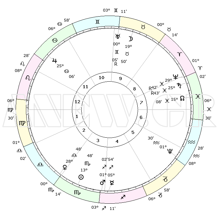 | | ΘΕΣΕΙΣ ΠΛΑΝΗΤΩΝ ΑΣΤΡΟΛΟΓΙΚΟΥ ΧΑΡΤΗ ΤΗΣ ΣΤΙΓΜΗΣ ΑΥΤΗΣ | | | | Πλανήτης | Ζώδιο | Μοίρες | Δεκαήμ. | Σε οίκο | Απόκλιση | | Ακμές των οίκων | | Ηλιος | Σκορπιός | 13°41' | Δεύτερο | 4 | 15 S 57 | | 1ος | 01°01' | Λέων | | Σελήνη | Ταύρος | 17°57' | Δεύτερο | 10 | 21 N 27 | | 2ος | 22°07' | Λέων | | Ερμής | Τοξότης | 05°50' | Πρώτο | 5 | 24 S 00 | | 3ος | 17°18' | Παρθένος | | Αφροδίτη | Ζυγός | 28°39' | Τρίτο | 4 | 09 S 41 | | 4ος | 18°28' | Ζυγός | | Αρης | Τοξότης | 00°57' | Πρώτο | 5 | 20 S 46 | | 5ος | 24°29' | Σκορπιός | | Δίας | Καρκίνος | 25°06' | Τρίτο | 12 | 21 N 12 | | 6ος | 00°01' | Αιγόκερως | | Κρόνος | Ιχθείς | 25°43'R | Τρίτο | 9 | 03 S 57 | | 7ος | 01°01' | Υδροχόος | | Ουρανός | Δίδυμοι | 00°05'R | Πρώτο | 11 | 19 N 57 | | 8ος | 22°07' | Υδροχόος | | Ποσειδώνας | Ιχθείς | 29°42'R | Τρίτο | 9 | 01 S 22 | | 9ος | 17°18' | Ιχθείς | | Πλούτωνας | Υδροχόος | 01°30' | Πρώτο | 7 | 23 S 30 | | 10ος | 18°28' | Κριός | | Β. Δεσμός | Ιχθείς | 15°09' | Δεύτερο | 8 | 05 S 51 | | 11ος | 24°29' | Ταύρος | | Ωροσκόπος | Λέων | 01°01' | Πρώτο | | | 12ος | 00°01' | Καρκίνος | | Μεσουράνημα | Κριός | 18°28' | Δεύτερο | | | |