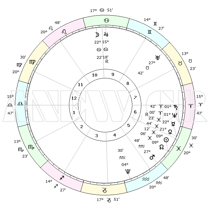 | | ΘΕΣΕΙΣ ΠΛΑΝΗΤΩΝ ΑΣΤΡΟΛΟΓΙΚΟΥ ΧΑΡΤΗ ΤΗΣ ΣΤΙΓΜΗΣ ΑΥΤΗΣ | | | | Πλανήτης | Ζώδιο | Μοίρες | Δεκαήμ. | Σε οίκο | Απόκλιση | | Ακμές των οίκων | | Ηλιος | Ιχθείς | 09°09' | Πρώτο | 6 | 08 S 08 | | 1ος | 00°14' | Ζυγός | | Σελήνη | Καρκίνος | 21°37' | Τρίτο | 10 | 25 N 32 | | 2ος | 26°51' | Ζυγός | | Ερμής | Ιχθείς | 22°24'R | Τρίτο | 6 | 00 S 11 | | 3ος | 27°17' | Σκορπιός | | Αφροδίτη | Ιχθείς | 21°40' | Τρίτο | 6 | 04 S 34 | | 4ος | 00°16' | Αιγόκερως | | Αρης | Υδροχόος | 27°46' | Τρίτο | 5 | 13 S 16 | | 5ος | 03°15' | Υδροχόος | | Δίας | Καρκίνος | 15°18'R | Δεύτερο | 10 | 22 N 54 | | 6ος | 03°40' | Ιχθείς | | Κρόνος | Κριός | 01°41' | Πρώτο | 7 | 01 S 17 | | 7ος | 00°14' | Κριός | | Ουρανός | Ταύρος | 27°42' | Τρίτο | 9 | 19 N 28 | | 8ος | 26°51' | Κριός | | Ποσειδώνας | Κριός | 01°00' | Πρώτο | 7 | 00 S 48 | | 9ος | 27°17' | Ταύρος | | Πλούτωνας | Υδροχόος | 04°30' | Πρώτο | 5 | 22 S 53 | | 10ος | 00°16' | Καρκίνος | | Β. Δεσμός | Ιχθείς | 09°07' | Πρώτο | 6 | 08 S 09 | | 11ος | 03°15' | Λέων | | Ωροσκόπος | Ζυγός | 00°14' | Πρώτο | | | 12ος | 03°40' | Παρθένος | | Μεσουράνημα | Καρκίνος | 00°16' | Πρώτο | | | |