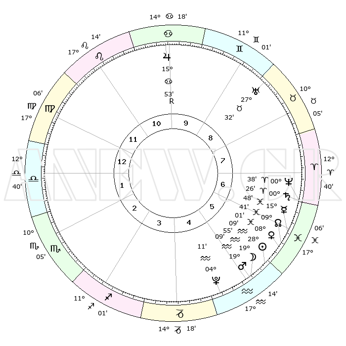 | | ΘΕΣΕΙΣ ΠΛΑΝΗΤΩΝ ΑΣΤΡΟΛΟΓΙΚΟΥ ΧΑΡΤΗ ΤΗΣ ΣΤΙΓΜΗΣ ΑΥΤΗΣ | | | | Πλανήτης | Ζώδιο | Μοίρες | Δεκαήμ. | Σε οίκο | Απόκλιση | | Ακμές των οίκων | | Ηλιος | Υδροχόος | 28°05' | Τρίτο | 6 | 12 S 08 | | 1ος | 24°39' | Παρθένος | | Σελήνη | Υδροχόος | 19°08' | Δεύτερο | 5 | 16 S 47 | | 2ος | 20°50' | Ζυγός | | Ερμής | Ιχθείς | 15°43' | Δεύτερο | 6 | 05 S 13 | | 3ος | 21°03' | Σκορπιός | | Αφροδίτη | Ιχθείς | 07°56' | Πρώτο | 6 | 09 S 57 | | 4ος | 23°60' | Τοξότης | | Αρης | Υδροχόος | 19°07' | Δεύτερο | 5 | 16 S 07 | | 5ος | 27°04' | Αιγόκερως | | Δίας | Καρκίνος | 15°54'R | Δεύτερο | 10 | 22 N 49 | | 6ος | 27°42' | Υδροχόος | | Κρόνος | Κριός | 00°25' | Πρώτο | 7 | 01 S 48 | | 7ος | 24°39' | Ιχθείς | | Ουρανός | Ταύρος | 27°32' | Τρίτο | 9 | 19 N 25 | | 8ος | 20°50' | Κριός | | Ποσειδώνας | Κριός | 00°38' | Πρώτο | 7 | 00 S 57 | | 9ος | 21°03' | Ταύρος | | Πλούτωνας | Υδροχόος | 04°11' | Πρώτο | 5 | 22 S 56 | | 10ος | 23°60' | Δίδυμοι | | Β. Δεσμός | Ιχθείς | 09°42' | Πρώτο | 6 | 07 S 56 | | 11ος | 27°04' | Καρκίνος | | Ωροσκόπος | Παρθένος | 24°39' | Τρίτο | | | 12ος | 27°42' | Λέων | | Μεσουράνημα | Δίδυμοι | 23°60' | Τρίτο | | | |