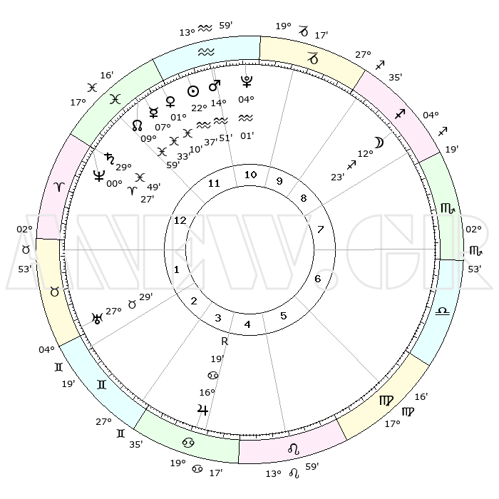 | | ΘΕΣΕΙΣ ΠΛΑΝΗΤΩΝ ΑΣΤΡΟΛΟΓΙΚΟΥ ΧΑΡΤΗ ΤΗΣ ΣΤΙΓΜΗΣ ΑΥΤΗΣ | | | | Πλανήτης | Ζώδιο | Μοίρες | Δεκαήμ. | Σε οίκο | Απόκλιση | | Ακμές των οίκων | | Ηλιος | Υδροχόος | 22°34' | Τρίτο | 12 | 13 S 59 | | 1ος | 02°10' | Κριός | | Σελήνη | Τοξότης | 11°44' | Δεύτερο | 9 | 27 S 23 | | 2ος | 11°56' | Ταύρος | | Ερμής | Ιχθείς | 07°28' | Πρώτο | 12 | 09 S 24 | | 3ος | 09°00' | Δίδυμοι | | Αφροδίτη | Ιχθείς | 01°06' | Πρώτο | 12 | 12 S 27 | | 4ος | 01°13' | Καρκίνος | | Αρης | Υδροχόος | 14°49' | Δεύτερο | 11 | 17 S 25 | | 5ος | 23°37' | Καρκίνος | | Δίας | Καρκίνος | 16°20'R | Δεύτερο | 4 | 22 N 45 | | 6ος | 21°21' | Λέων | | Κρόνος | Ιχθείς | 29°49' | Τρίτο | 12 | 02 S 03 | | 7ος | 02°10' | Ζυγός | | Ουρανός | Ταύρος | 27°29' | Τρίτο | 2 | 19 N 25 | | 8ος | 11°56' | Σκορπιός | | Ποσειδώνας | Κριός | 00°27' | Πρώτο | 12 | 01 S 01 | | 9ος | 09°00' | Τοξότης | | Πλούτωνας | Υδροχόος | 04°01' | Πρώτο | 11 | 22 S 58 | | 10ος | 01°13' | Αιγόκερως | | Β. Δεσμός | Ιχθείς | 09°59' | Πρώτο | 12 | 07 S 49 | | 11ος | 23°37' | Αιγόκερως | | Ωροσκόπος | Κριός | 02°10' | Πρώτο | | | 12ος | 21°21' | Υδροχόος | | Μεσουράνημα | Αιγόκερως | 01°13' | Πρώτο | | | |