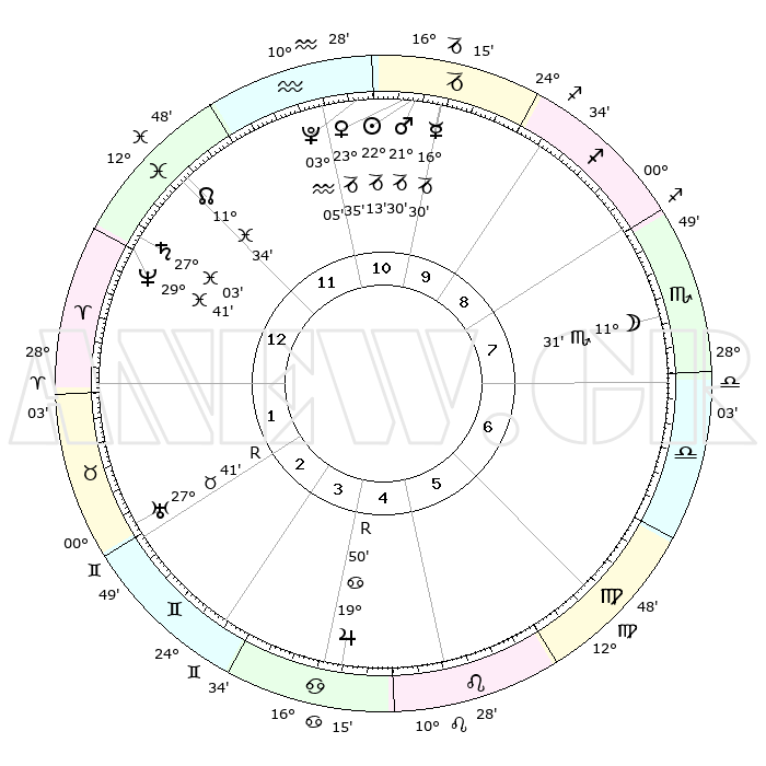 | | ΘΕΣΕΙΣ ΠΛΑΝΗΤΩΝ ΑΣΤΡΟΛΟΓΙΚΟΥ ΧΑΡΤΗ ΤΗΣ ΣΤΙΓΜΗΣ ΑΥΤΗΣ | | | | Πλανήτης | Ζώδιο | Μοίρες | Δεκαήμ. | Σε οίκο | Απόκλιση | | Ακμές των οίκων | | Ηλιος | Αιγόκερως | 22°08' | Τρίτο | 11 | 21 S 37 | | 1ος | 15°53' | Ιχθείς | | Σελήνη | Σκορπιός | 10°39' | Δεύτερο | 8 | 19 S 15 | | 2ος | 29°12' | Κριός | | Ερμής | Αιγόκερως | 16°23' | Δεύτερο | 11 | 24 S 02 | | 3ος | 28°56' | Ταύρος | | Αφροδίτη | Αιγόκερως | 23°30' | Τρίτο | 11 | 22 S 16 | | 4ος | 22°01' | Δίδυμοι | | Αρης | Αιγόκερως | 21°26' | Τρίτο | 11 | 22 S 40 | | 5ος | 13°51' | Καρκίνος | | Δίας | Καρκίνος | 19°50'R | Δεύτερο | 5 | 22 N 14 | | 6ος | 09°15' | Λέων | | Κρόνος | Ιχθείς | 27°03' | Τρίτο | 1 | 03 S 13 | | 7ος | 15°53' | Παρθένος | | Ουρανός | Ταύρος | 27°41'R | Τρίτο | 2 | 19 N 27 | | 8ος | 29°12' | Ζυγός | | Ποσειδώνας | Ιχθείς | 29°41' | Τρίτο | 1 | 01 S 21 | | 9ος | 28°56' | Σκορπιός | | Πλούτωνας | Υδροχόος | 03°04' | Πρώτο | 11 | 23 S 09 | | 10ος | 22°01' | Τοξότης | | Β. Δεσμός | Ιχθείς | 11°34' | Δεύτερο | 12 | 07 S 13 | | 11ος | 13°51' | Αιγόκερως | | Ωροσκόπος | Ιχθείς | 15°53' | Δεύτερο | | | 12ος | 09°15' | Υδροχόος | | Μεσουράνημα | Τοξότης | 22°01' | Τρίτο | | | |