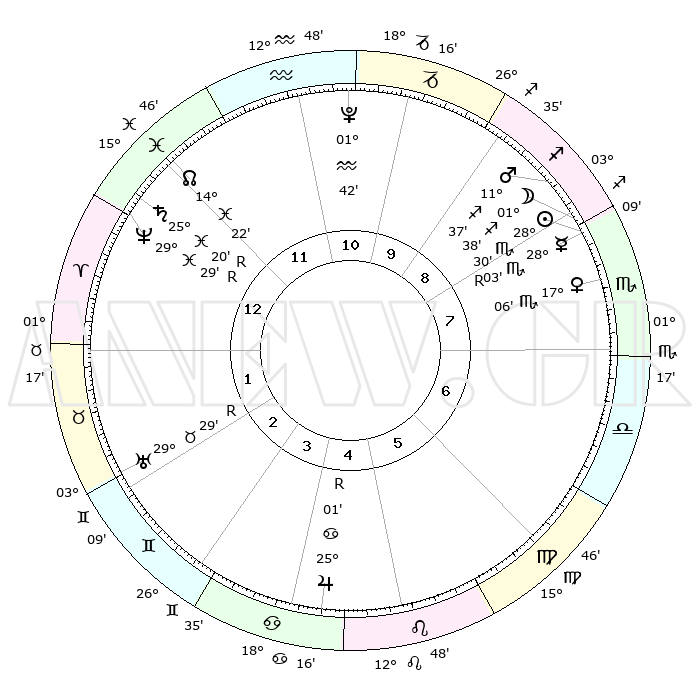 | | ΘΕΣΕΙΣ ΠΛΑΝΗΤΩΝ ΑΣΤΡΟΛΟΓΙΚΟΥ ΧΑΡΤΗ ΤΗΣ ΣΤΙΓΜΗΣ ΑΥΤΗΣ | | | | Πλανήτης | Ζώδιο | Μοίρες | Δεκαήμ. | Σε οίκο | Απόκλιση | | Ακμές των οίκων | | Ηλιος | Σκορπιός | 28°26' | Τρίτο | 8 | 19 S 48 | | 1ος | 23°26' | Ιχθείς | | Σελήνη | Τοξότης | 00°51' | Πρώτο | 8 | 25 S 04 | | 2ος | 05°14' | Ταύρος | | Ερμής | Σκορπιός | 28°09'R | Τρίτο | 8 | 19 S 10 | | 3ος | 03°41' | Δίδυμοι | | Αφροδίτη | Σκορπιός | 17°01' | Δεύτερο | 8 | 15 S 54 | | 4ος | 26°18' | Δίδυμοι | | Αρης | Τοξότης | 11°34' | Δεύτερο | 9 | 22 S 44 | | 5ος | 18°21' | Καρκίνος | | Δίας | Καρκίνος | 25°01'R | Τρίτο | 5 | 21 N 15 | | 6ος | 14°47' | Λέων | | Κρόνος | Ιχθείς | 25°20'R | Τρίτο | 1 | 04 S 04 | | 7ος | 23°26' | Παρθένος | | Ουρανός | Ταύρος | 29°29'R | Τρίτο | 2 | 19 N 50 | | 8ος | 05°14' | Σκορπιός | | Ποσειδώνας | Ιχθείς | 29°29'R | Τρίτο | 1 | 01 S 27 | | 9ος | 03°41' | Τοξότης | | Πλούτωνας | Υδροχόος | 01°42' | Πρώτο | 11 | 23 S 27 | | 10ος | 26°18' | Τοξότης | | Β. Δεσμός | Ιχθείς | 14°22' | Δεύτερο | 12 | 06 S 09 | | 11ος | 18°21' | Αιγόκερως | | Ωροσκόπος | Ιχθείς | 23°26' | Τρίτο | | | 12ος | 14°47' | Υδροχόος | | Μεσουράνημα | Τοξότης | 26°18' | Τρίτο | | | |