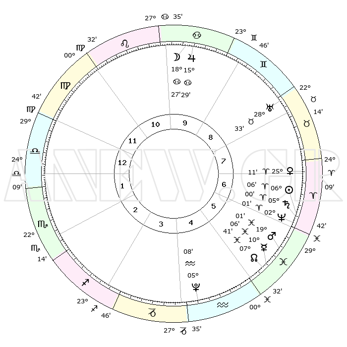 | | ΘΕΣΕΙΣ ΠΛΑΝΗΤΩΝ ΑΣΤΡΟΛΟΓΙΚΟΥ ΧΑΡΤΗ ΤΗΣ ΣΤΙΓΜΗΣ ΑΥΤΗΣ | | | | Πλανήτης | Ζώδιο | Μοίρες | Δεκαήμ. | Σε οίκο | Απόκλιση | | Ακμές των οίκων | | Ηλιος | Κριός | 06°02' | Πρώτο | 7 | 02 N 24 | | 1ος | 05°48' | Ζυγός | | Σελήνη | Καρκίνος | 17°35' | Δεύτερο | 10 | 26 N 19 | | 2ος | 02°47' | Σκορπιός | | Ερμής | Ιχθείς | 10°04' | Δεύτερο | 6 | 08 S 07 | | 3ος | 03°27' | Τοξότης | | Αφροδίτη | Κριός | 25°06' | Τρίτο | 7 | 09 N 06 | | 4ος | 06°31' | Αιγόκερως | | Αρης | Ιχθείς | 18°58' | Δεύτερο | 6 | 05 S 20 | | 5ος | 09°27' | Υδροχόος | | Δίας | Καρκίνος | 15°29' | Δεύτερο | 10 | 22 N 54 | | 6ος | 09°39' | Ιχθείς | | Κρόνος | Κριός | 05°00' | Πρώτο | 6 | 00 N 02 | | 7ος | 05°48' | Κριός | | Ουρανός | Ταύρος | 28°32' | Τρίτο | 8 | 19 N 40 | | 8ος | 02°47' | Ταύρος | | Ποσειδώνας | Κριός | 02°01' | Πρώτο | 6 | 00 S 24 | | 9ος | 03°27' | Δίδυμοι | | Πλούτωνας | Υδροχόος | 05°08' | Πρώτο | 4 | 22 S 48 | | 10ος | 06°31' | Καρκίνος | | Β. Δεσμός | Ιχθείς | 07°41' | Πρώτο | 5 | 08 S 41 | | 11ος | 09°27' | Λέων | | Ωροσκόπος | Ζυγός | 05°48' | Πρώτο | | | 12ος | 09°39' | Παρθένος | | Μεσουράνημα | Καρκίνος | 06°31' | Πρώτο | | | |
