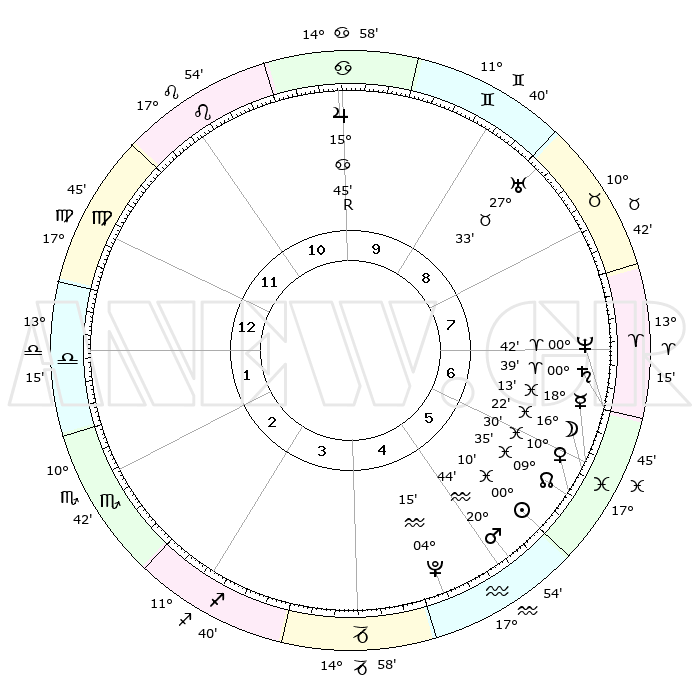 | | ΘΕΣΕΙΣ ΠΛΑΝΗΤΩΝ ΑΣΤΡΟΛΟΓΙΚΟΥ ΧΑΡΤΗ ΤΗΣ ΣΤΙΓΜΗΣ ΑΥΤΗΣ | | | | Πλανήτης | Ζώδιο | Μοίρες | Δεκαήμ. | Σε οίκο | Απόκλιση | | Ακμές των οίκων | | Ηλιος | Ιχθείς | 00°05' | Πρώτο | 6 | 11 S 26 | | 1ος | 21°58' | Παρθένος | | Σελήνη | Ιχθείς | 15°24' | Δεύτερο | 6 | 05 S 12 | | 2ος | 17°56' | Ζυγός | | Ερμής | Ιχθείς | 18°08' | Δεύτερο | 6 | 03 S 50 | | 3ος | 18°02' | Σκορπιός | | Αφροδίτη | Ιχθείς | 10°25' | Δεύτερο | 6 | 09 S 01 | | 4ος | 20°58' | Τοξότης | | Αρης | Υδροχόος | 20°40' | Τρίτο | 5 | 15 S 38 | | 5ος | 24°06' | Αιγόκερως | | Δίας | Καρκίνος | 15°46'R | Δεύτερο | 10 | 22 N 50 | | 6ος | 24°50' | Υδροχόος | | Κρόνος | Κριός | 00°39' | Πρώτο | 7 | 01 S 43 | | 7ος | 21°58' | Ιχθείς | | Ουρανός | Ταύρος | 27°33' | Τρίτο | 9 | 19 N 26 | | 8ος | 17°56' | Κριός | | Ποσειδώνας | Κριός | 00°41' | Πρώτο | 7 | 00 S 56 | | 9ος | 18°02' | Ταύρος | | Πλούτωνας | Υδροχόος | 04°15' | Πρώτο | 5 | 22 S 55 | | 10ος | 20°58' | Δίδυμοι | | Β. Δεσμός | Ιχθείς | 09°35' | Πρώτο | 6 | 07 S 58 | | 11ος | 24°06' | Καρκίνος | | Ωροσκόπος | Παρθένος | 21°58' | Τρίτο | | | 12ος | 24°50' | Λέων | | Μεσουράνημα | Δίδυμοι | 20°58' | Τρίτο | | | |