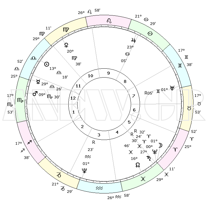| ΘΕΣΕΙΣ ΠΛΑΝΗΤΩΝ ΑΣΤΡΟΛΟΓΙΚΟΥ ΧΑΡΤΗ ΤΗΣ ΣΤΙΓΜΗΣ ΑΥΤΗΣ | | Πλανήτης | Ζώδιο | Μοίρες | Δεκαήμ. | Σε οίκο | Απόκλιση | | Ακμές των οίκων | Ηλιος | Ζυγός | 13°12' | Δεύτερο | 12 | 05 S 13 | | 1ος | 20°14' | Ζυγός | Σελήνη | Κριός | 00°09' | Πρώτο | 6 | 01 N 03 | | 2ος | 18°06' | Σκορπιός | Ερμής | Ζυγός | 29°17' | Τρίτο | 1 | 11 S 54 | | 3ος | 19°24' | Τοξότης | Αφροδίτη | Παρθένος | 20°30' | Τρίτο | 11 | 05 N 03 | | 4ος | 23°00' | Αιγόκερως | Αρης | Σκορπιός | 09°26' | Πρώτο | 1 | 14 S 45 | | 5ος | 25°57' | Υδροχόος | Δίας | Καρκίνος | 23°04' | Τρίτο | 10 | 21 N 29 | | 6ος | 25°23' | Ιχθείς | Κρόνος | Ιχθείς | 27°30'R | Τρίτο | 6 | 03 S 18 | | 7ος | 20°14' | Κριός | Ουρανός | Δίδυμοι | 01°05'R | Πρώτο | 8 | 20 N 10 | | 8ος | 18°06' | Ταύρος | Ποσειδώνας | Κριός | 00°24'R | Πρώτο | 6 | 01 S 06 | | 9ος | 19°24' | Δίδυμοι | Πλούτωνας | Υδροχόος | 01°23'R | Πρώτο | 4 | 23 S 32 | | 10ος | 23°00' | Καρκίνος | Β. Δεσμός | Ιχθείς | 16°46' | Δεύτερο | 5 | 05 S 13 | | 11ος | 25°57' | Λέων | Ωροσκόπος | Ζυγός | 20°14' | Τρίτο | | | 12ος | 25°23' | Παρθένος | Μεσουράνημα | Καρκίνος | 23°00' | Τρίτο | | | |
