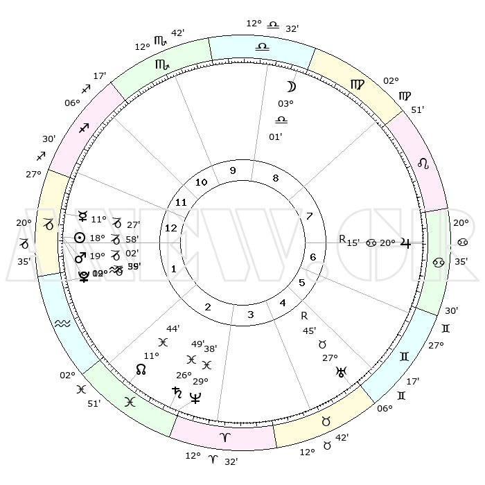 | | ΘΕΣΕΙΣ ΠΛΑΝΗΤΩΝ ΑΣΤΡΟΛΟΓΙΚΟΥ ΧΑΡΤΗ ΤΗΣ ΣΤΙΓΜΗΣ ΑΥΤΗΣ | | | | Πλανήτης | Ζώδιο | Μοίρες | Δεκαήμ. | Σε οίκο | Απόκλιση | | Ακμές των οίκων | | Ηλιος | Αιγόκερως | 18°07' | Δεύτερο | 10 | 22 S 12 | | 1ος | 12°29' | Κριός | | Σελήνη | Παρθένος | 22°25' | Τρίτο | 6 | 02 N 01 | | 2ος | 19°33' | Ταύρος | | Ερμής | Αιγόκερως | 10°08' | Δεύτερο | 10 | 24 S 21 | | 3ος | 15°10' | Δίδυμοι | | Αφροδίτη | Αιγόκερως | 18°32' | Δεύτερο | 10 | 22 S 55 | | 4ος | 07°03' | Καρκίνος | | Αρης | Αιγόκερως | 18°24' | Δεύτερο | 10 | 23 S 06 | | 5ος | 00°01' | Λέων | | Δίας | Καρκίνος | 20°22'R | Τρίτο | 4 | 22 N 09 | | 6ος | 29°28' | Λέων | | Κρόνος | Ιχθείς | 26°46' | Τρίτο | 12 | 03 S 20 | | 7ος | 12°29' | Ζυγός | | Ουρανός | Ταύρος | 27°46'R | Τρίτο | 2 | 19 N 28 | | 8ος | 19°33' | Σκορπιός | | Ποσειδώνας | Ιχθείς | 29°37' | Τρίτο | 12 | 01 S 22 | | 9ος | 15°10' | Τοξότης | | Πλούτωνας | Υδροχόος | 02°57' | Πρώτο | 11 | 23 S 10 | | 10ος | 07°03' | Αιγόκερως | | Β. Δεσμός | Ιχθείς | 11°47' | Δεύτερο | 12 | 07 S 09 | | 11ος | 00°01' | Υδροχόος | | Ωροσκόπος | Κριός | 12°29' | Δεύτερο | | | 12ος | 29°28' | Υδροχόος | | Μεσουράνημα | Αιγόκερως | 07°03' | Πρώτο | | | |