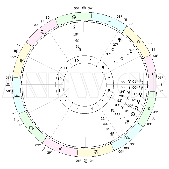 | | ΘΕΣΕΙΣ ΠΛΑΝΗΤΩΝ ΑΣΤΡΟΛΟΓΙΚΟΥ ΧΑΡΤΗ ΤΗΣ ΣΤΙΓΜΗΣ ΑΥΤΗΣ | | | | Πλανήτης | Ζώδιο | Μοίρες | Δεκαήμ. | Σε οίκο | Απόκλιση | | Ακμές των οίκων | | Ηλιος | Ιχθείς | 04°05' | Πρώτο | 6 | 10 S 01 | | 1ος | 14°21' | Παρθένος | | Σελήνη | Ταύρος | 10°14' | Δεύτερο | 9 | 19 N 17 | | 2ος | 09°38' | Ζυγός | | Ερμής | Ιχθείς | 21°32' | Τρίτο | 7 | 01 S 35 | | 3ος | 09°22' | Σκορπιός | | Αφροδίτη | Ιχθείς | 15°22' | Δεύτερο | 7 | 07 S 05 | | 4ος | 12°18' | Τοξότης | | Αρης | Υδροχόος | 23°48' | Τρίτο | 6 | 14 S 37 | | 5ος | 15°41' | Αιγόκερως | | Δίας | Καρκίνος | 15°31'R | Δεύτερο | 10 | 22 N 52 | | 6ος | 16°46' | Υδροχόος | | Κρόνος | Κριός | 01°06' | Πρώτο | 7 | 01 S 32 | | 7ος | 14°21' | Ιχθείς | | Ουρανός | Ταύρος | 27°37' | Τρίτο | 9 | 19 N 27 | | 8ος | 09°38' | Κριός | | Ποσειδώνας | Κριός | 00°50' | Πρώτο | 7 | 00 S 52 | | 9ος | 09°22' | Ταύρος | | Πλούτωνας | Υδροχόος | 04°22' | Πρώτο | 5 | 22 S 54 | | 10ος | 12°18' | Δίδυμοι | | Β. Δεσμός | Ιχθείς | 09°23' | Πρώτο | 6 | 08 S 03 | | 11ος | 15°41' | Καρκίνος | | Ωροσκόπος | Παρθένος | 14°21' | Δεύτερο | | | 12ος | 16°46' | Λέων | | Μεσουράνημα | Δίδυμοι | 12°18' | Δεύτερο | | | |