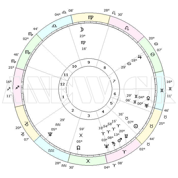 | | ΘΕΣΕΙΣ ΠΛΑΝΗΤΩΝ ΑΣΤΡΟΛΟΓΙΚΟΥ ΧΑΡΤΗ ΤΗΣ ΣΤΙΓΜΗΣ ΑΥΤΗΣ | | | | Πλανήτης | Ζώδιο | Μοίρες | Δεκαήμ. | Σε οίκο | Απόκλιση | | Ακμές των οίκων | | Ηλιος | Ταύρος | 07°32' | Πρώτο | 6 | 14 N 01 | | 1ος | 28°23' | Σκορπιός | | Σελήνη | Παρθένος | 22°30' | Τρίτο | 10 | 01 N 45 | | 2ος | 29°18' | Τοξότης | | Ερμής | Κριός | 20°08' | Τρίτο | 5 | 05 N 48 | | 3ος | 04°45' | Υδροχόος | | Αφροδίτη | Δίδυμοι | 04°24' | Πρώτο | 7 | 21 N 46 | | 4ος | 10°45' | Ιχθείς | | Αρης | Κριός | 13°55' | Δεύτερο | 5 | 04 N 39 | | 5ος | 11°59' | Κριός | | Δίας | Καρκίνος | 18°29' | Δεύτερο | 8 | 22 N 33 | | 6ος | 07°15' | Ταύρος | | Κρόνος | Κριός | 08°54' | Πρώτο | 4 | 01 N 32 | | 7ος | 28°23' | Ταύρος | | Ουρανός | Δίδυμοι | 00°06' | Πρώτο | 7 | 20 N 00 | | 8ος | 29°18' | Δίδυμοι | | Ποσειδώνας | Κριός | 03°10' | Πρώτο | 4 | 00 N 03 | | 9ος | 04°45' | Λέων | | Πλούτωνας | Υδροχόος | 05°29' | Πρώτο | 3 | 22 S 48 | | 10ος | 10°45' | Παρθένος | | Β. Δεσμός | Ιχθείς | 05°59' | Πρώτο | 3 | 09 S 19 | | 11ος | 11°59' | Ζυγός | | Ωροσκόπος | Σκορπιός | 28°23' | Τρίτο | | | 12ος | 07°15' | Σκορπιός | | Μεσουράνημα | Παρθένος | 10°45' | Δεύτερο | | | |