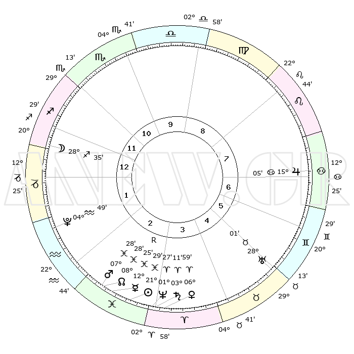 | | ΘΕΣΕΙΣ ΠΛΑΝΗΤΩΝ ΑΣΤΡΟΛΟΓΙΚΟΥ ΧΑΡΤΗ ΤΗΣ ΣΤΙΓΜΗΣ ΑΥΤΗΣ | | | | Πλανήτης | Ζώδιο | Μοίρες | Δεκαήμ. | Σε οίκο | Απόκλιση | | Ακμές των οίκων | | Ηλιος | Ιχθείς | 21°25' | Τρίτο | 3 | 03 S 24 | | 1ος | 23°36' | Τοξότης | | Σελήνη | Τοξότης | 27°55' | Τρίτο | 1 | 28 S 24 | | 2ος | 29°11' | Αιγόκερως | | Ερμής | Ιχθείς | 12°28'R | Δεύτερο | 3 | 04 S 03 | | 3ος | 08°35' | Ιχθείς | | Αφροδίτη | Κριός | 06°54' | Πρώτο | 3 | 01 N 42 | | 4ος | 13°26' | Κριός | | Αρης | Ιχθείς | 07°25' | Πρώτο | 2 | 09 S 48 | | 5ος | 10°48' | Ταύρος | | Δίας | Καρκίνος | 15°05' | Δεύτερο | 7 | 22 N 56 | | 6ος | 03°05' | Δίδυμοι | | Κρόνος | Κριός | 03°10' | Πρώτο | 3 | 00 S 41 | | 7ος | 23°36' | Δίδυμοι | | Ουρανός | Ταύρος | 28°01' | Τρίτο | 5 | 19 N 32 | | 8ος | 29°11' | Καρκίνος | | Ποσειδώνας | Κριός | 01°27' | Πρώτο | 3 | 00 S 37 | | 9ος | 08°35' | Παρθένος | | Πλούτωνας | Υδροχόος | 04°49' | Πρώτο | 2 | 22 S 50 | | 10ος | 13°26' | Ζυγός | | Β. Δεσμός | Ιχθείς | 08°28' | Πρώτο | 2 | 08 S 24 | | 11ος | 10°48' | Σκορπιός | | Ωροσκόπος | Τοξότης | 23°36' | Τρίτο | | | 12ος | 03°05' | Τοξότης | | Μεσουράνημα | Ζυγός | 13°26' | Δεύτερο | | | |
