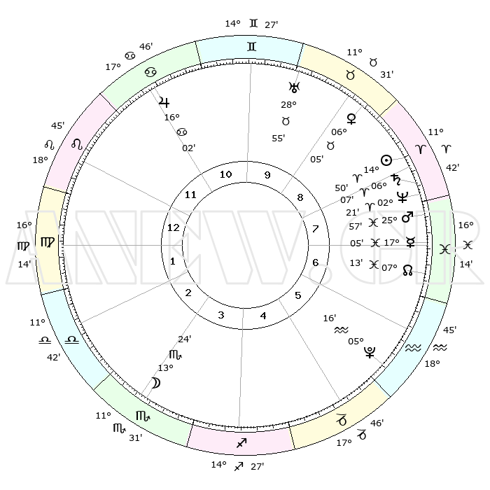 | | ΘΕΣΕΙΣ ΠΛΑΝΗΤΩΝ ΑΣΤΡΟΛΟΓΙΚΟΥ ΧΑΡΤΗ ΤΗΣ ΣΤΙΓΜΗΣ ΑΥΤΗΣ | | | | Πλανήτης | Ζώδιο | Μοίρες | Δεκαήμ. | Σε οίκο | Απόκλιση | | Ακμές των οίκων | | Ηλιος | Κριός | 14°46' | Δεύτερο | 8 | 05 N 49 | | 1ος | 27°45' | Λέων | | Σελήνη | Σκορπιός | 12°38' | Δεύτερο | 3 | 20 S 03 | | 2ος | 21°22' | Παρθένος | | Ερμής | Ιχθείς | 17°01' | Δεύτερο | 7 | 06 S 47 | | 3ος | 19°50' | Ζυγός | | Αφροδίτη | Ταύρος | 06°00' | Πρώτο | 9 | 13 N 14 | | 4ος | 22°43' | Σκορπιός | | Αρης | Ιχθείς | 25°54' | Τρίτο | 8 | 02 S 35 | | 5ος | 27°04' | Τοξότης | | Δίας | Καρκίνος | 16°02' | Δεύτερο | 11 | 22 N 50 | | 6ος | 29°12' | Αιγόκερως | | Κρόνος | Κριός | 06°06' | Πρώτο | 8 | 00 N 28 | | 7ος | 27°45' | Υδροχόος | | Ουρανός | Ταύρος | 28°55' | Τρίτο | 10 | 19 N 45 | | 8ος | 21°22' | Ιχθείς | | Ποσειδώνας | Κριός | 02°21' | Πρώτο | 8 | 00 S 16 | | 9ος | 19°50' | Κριός | | Πλούτωνας | Υδροχόος | 05°16' | Πρώτο | 6 | 22 S 47 | | 10ος | 22°43' | Ταύρος | | Β. Δεσμός | Ιχθείς | 07°13' | Πρώτο | 7 | 08 S 52 | | 11ος | 27°04' | Δίδυμοι | | Ωροσκόπος | Λέων | 27°45' | Τρίτο | | | 12ος | 29°12' | Καρκίνος | | Μεσουράνημα | Ταύρος | 22°43' | Τρίτο | | | |