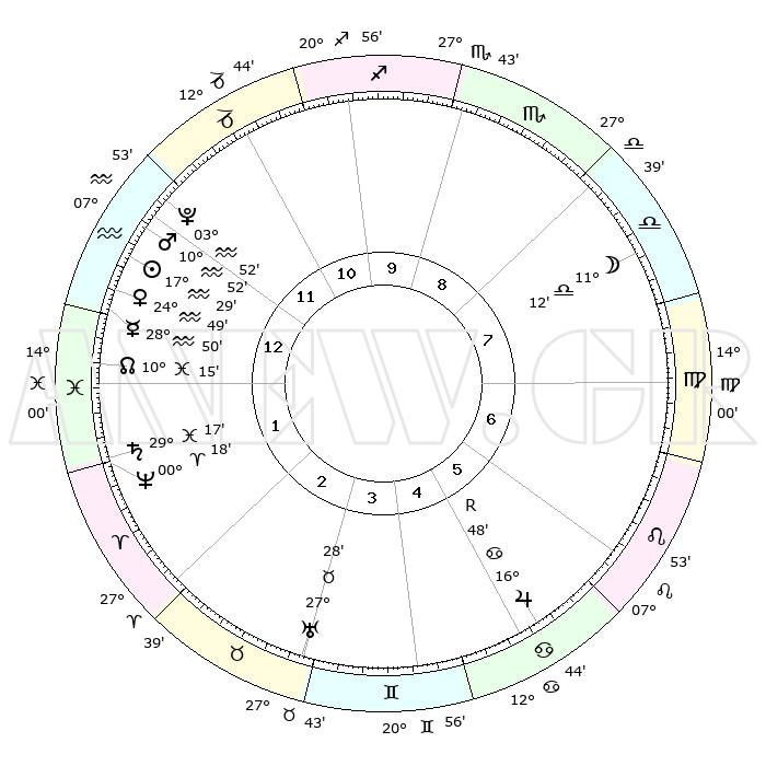 | | ΘΕΣΕΙΣ ΠΛΑΝΗΤΩΝ ΑΣΤΡΟΛΟΓΙΚΟΥ ΧΑΡΤΗ ΤΗΣ ΣΤΙΓΜΗΣ ΑΥΤΗΣ | | | | Πλανήτης | Ζώδιο | Μοίρες | Δεκαήμ. | Σε οίκο | Απόκλιση | | Ακμές των οίκων | | Ηλιος | Υδροχόος | 17°25' | Δεύτερο | 1 | 15 S 37 | | 1ος | 08°52' | Υδροχόος | | Σελήνη | Ζυγός | 10°21' | Δεύτερο | 8 | 06 S 36 | | 2ος | 24°08' | Ιχθείς | | Ερμής | Υδροχόος | 28°43' | Τρίτο | 1 | 13 S 15 | | 3ος | 01°02' | Ταύρος | | Αφροδίτη | Υδροχόος | 24°43' | Τρίτο | 1 | 14 S 37 | | 4ος | 28°04' | Ταύρος | | Αρης | Υδροχόος | 10°49' | Δεύτερο | 1 | 18 S 32 | | 5ος | 20°17' | Δίδυμοι | | Δίας | Καρκίνος | 16°48'R | Δεύτερο | 6 | 22 N 41 | | 6ος | 12°07' | Καρκίνος | | Κρόνος | Ιχθείς | 29°17' | Τρίτο | 2 | 02 S 16 | | 7ος | 08°52' | Λέων | | Ουρανός | Ταύρος | 27°28' | Τρίτο | 3 | 19 N 24 | | 8ος | 24°08' | Παρθένος | | Ποσειδώνας | Κριός | 00°18' | Πρώτο | 2 | 01 S 05 | | 9ος | 01°02' | Σκορπιός | | Πλούτωνας | Υδροχόος | 03°52' | Πρώτο | 12 | 22 S 59 | | 10ος | 28°04' | Σκορπιός | | Β. Δεσμός | Ιχθείς | 10°15' | Δεύτερο | 1 | 07 S 43 | | 11ος | 20°17' | Τοξότης | | Ωροσκόπος | Υδροχόος | 08°52' | Πρώτο | | | 12ος | 12°07' | Αιγόκερως | | Μεσουράνημα | Σκορπιός | 28°04' | Τρίτο | | | |