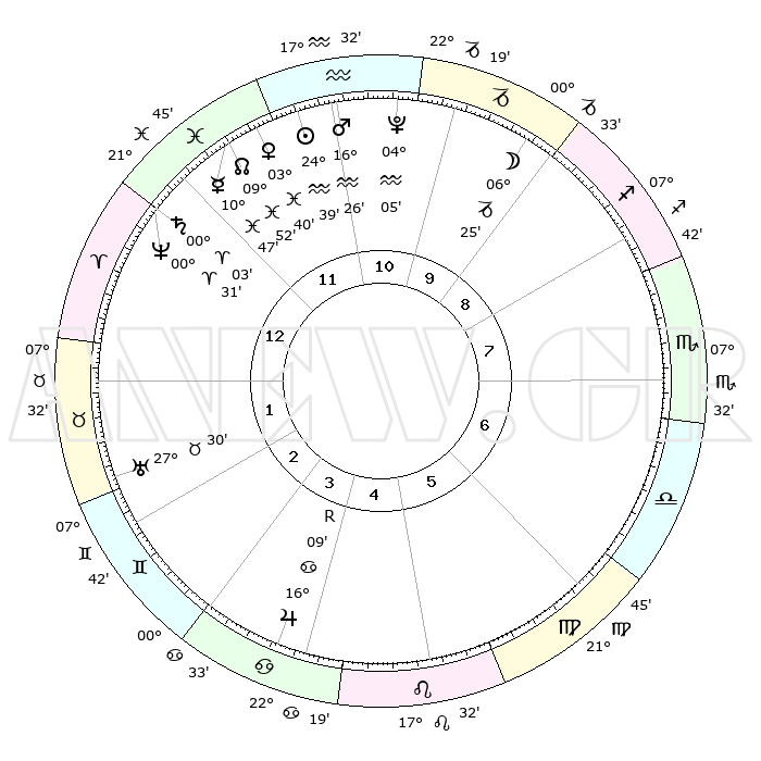| | ΘΕΣΕΙΣ ΠΛΑΝΗΤΩΝ ΑΣΤΡΟΛΟΓΙΚΟΥ ΧΑΡΤΗ ΤΗΣ ΣΤΙΓΜΗΣ ΑΥΤΗΣ | | | | Πλανήτης | Ζώδιο | Μοίρες | Δεκαήμ. | Σε οίκο | Απόκλιση | | Ακμές των οίκων | | Ηλιος | Υδροχόος | 24°34' | Τρίτο | 12 | 13 S 20 | | 1ος | 21°53' | Ιχθείς | | Σελήνη | Αιγόκερως | 05°26' | Πρώτο | 10 | 28 S 02 | | 2ος | 04°01' | Ταύρος | | Ερμής | Ιχθείς | 10°39' | Δεύτερο | 12 | 07 S 52 | | 3ος | 02°43' | Δίδυμοι | | Αφροδίτη | Ιχθείς | 03°34' | Πρώτο | 12 | 11 S 34 | | 4ος | 25°26' | Δίδυμοι | | Αρης | Υδροχόος | 16°22' | Δεύτερο | 12 | 16 S 57 | | 5ος | 17°26' | Καρκίνος | | Δίας | Καρκίνος | 16°10'R | Δεύτερο | 4 | 22 N 47 | | 6ος | 13°39' | Λέων | | Κρόνος | Κριός | 00°02' | Πρώτο | 1 | 01 S 58 | | 7ος | 21°53' | Παρθένος | | Ουρανός | Ταύρος | 27°30' | Τρίτο | 2 | 19 N 25 | | 8ος | 04°01' | Σκορπιός | | Ποσειδώνας | Κριός | 00°31' | Πρώτο | 1 | 01 S 00 | | 9ος | 02°43' | Τοξότης | | Πλούτωνας | Υδροχόος | 04°05' | Πρώτο | 11 | 22 S 57 | | 10ος | 25°26' | Τοξότης | | Β. Δεσμός | Ιχθείς | 09°53' | Πρώτο | 12 | 07 S 52 | | 11ος | 17°26' | Αιγόκερως | | Ωροσκόπος | Ιχθείς | 21°53' | Τρίτο | | | 12ος | 13°39' | Υδροχόος | | Μεσουράνημα | Τοξότης | 25°26' | Τρίτο | | | |
