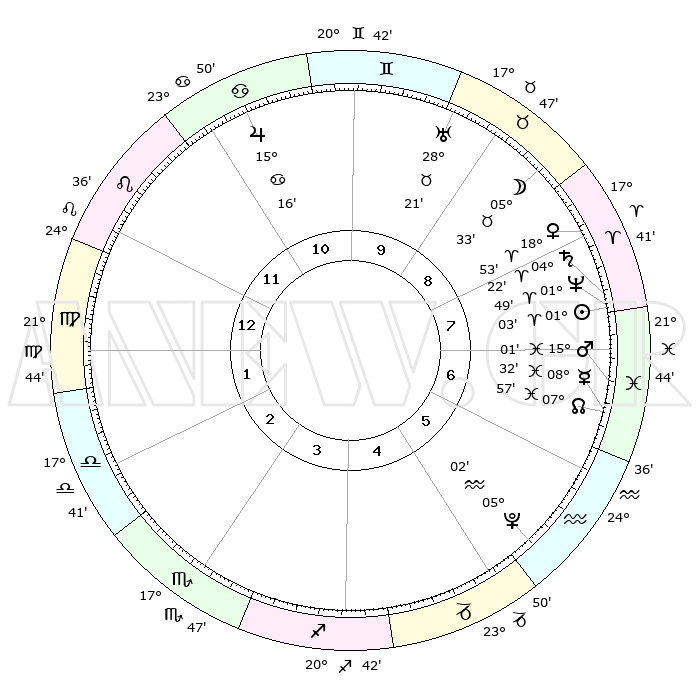 | | ΘΕΣΕΙΣ ΠΛΑΝΗΤΩΝ ΑΣΤΡΟΛΟΓΙΚΟΥ ΧΑΡΤΗ ΤΗΣ ΣΤΙΓΜΗΣ ΑΥΤΗΣ | | | | Πλανήτης | Ζώδιο | Μοίρες | Δεκαήμ. | Σε οίκο | Απόκλιση | | Ακμές των οίκων | | Ηλιος | Κριός | 00°59' | Πρώτο | 8 | 00 N 23 | | 1ος | 01°47' | Παρθένος | | Σελήνη | Ταύρος | 04°34' | Πρώτο | 9 | 17 N 07 | | 2ος | 25°50' | Παρθένος | | Ερμής | Ιχθείς | 08°31' | Πρώτο | 7 | 07 S 38 | | 3ος | 24°39' | Ζυγός | | Αφροδίτη | Κριός | 18°48' | Δεύτερο | 8 | 06 N 35 | | 4ος | 27°35' | Σκορπιός | | Αρης | Ιχθείς | 14°58' | Δεύτερο | 7 | 06 S 55 | | 5ος | 01°40' | Αιγόκερως | | Δίας | Καρκίνος | 15°16' | Δεύτερο | 11 | 22 N 55 | | 6ος | 03°29' | Υδροχόος | | Κρόνος | Κριός | 04°22' | Πρώτο | 8 | 00 S 13 | | 7ος | 01°47' | Ιχθείς | | Ουρανός | Ταύρος | 28°21' | Τρίτο | 10 | 19 N 37 | | 8ος | 25°50' | Ιχθείς | | Ποσειδώνας | Κριός | 01°49' | Πρώτο | 8 | 00 S 29 | | 9ος | 24°39' | Κριός | | Πλούτωνας | Υδροχόος | 05°02' | Πρώτο | 6 | 22 S 48 | | 10ος | 27°35' | Ταύρος | | Β. Δεσμός | Ιχθείς | 07°57' | Πρώτο | 7 | 08 S 35 | | 11ος | 01°40' | Καρκίνος | | Ωροσκόπος | Παρθένος | 01°47' | Πρώτο | | | 12ος | 03°29' | Λέων | | Μεσουράνημα | Ταύρος | 27°35' | Τρίτο | | | |