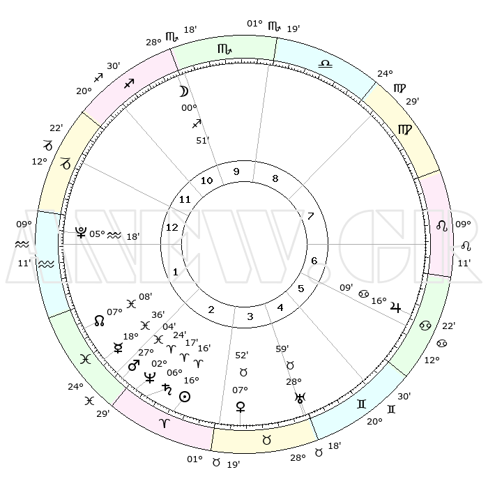 | | ΘΕΣΕΙΣ ΠΛΑΝΗΤΩΝ ΑΣΤΡΟΛΟΓΙΚΟΥ ΧΑΡΤΗ ΤΗΣ ΣΤΙΓΜΗΣ ΑΥΤΗΣ | | | | Πλανήτης | Ζώδιο | Μοίρες | Δεκαήμ. | Σε οίκο | Απόκλιση | | Ακμές των οίκων | | Ηλιος | Κριός | 16°12' | Δεύτερο | 3 | 06 N 22 | | 1ος | 11°29' | Αιγόκερως | | Σελήνη | Τοξότης | 00°02' | Πρώτο | 11 | 25 S 09 | | 2ος | 21°34' | Υδροχόος | | Ερμής | Ιχθείς | 18°32' | Δεύτερο | 2 | 06 S 21 | | 3ος | 01°50' | Κριός | | Αφροδίτη | Ταύρος | 07°47' | Πρώτο | 4 | 13 N 53 | | 4ος | 03°44' | Ταύρος | | Αρης | Ιχθείς | 27°01' | Τρίτο | 2 | 02 S 08 | | 5ος | 28°22' | Ταύρος | | Δίας | Καρκίνος | 16°08' | Δεύτερο | 7 | 22 N 50 | | 6ος | 19°40' | Δίδυμοι | | Κρόνος | Κριός | 06°17' | Πρώτο | 3 | 00 N 32 | | 7ος | 11°29' | Καρκίνος | | Ουρανός | Ταύρος | 28°59' | Τρίτο | 5 | 19 N 46 | | 8ος | 21°34' | Λέων | | Ποσειδώνας | Κριός | 02°24' | Πρώτο | 3 | 00 S 15 | | 9ος | 01°50' | Ζυγός | | Πλούτωνας | Υδροχόος | 05°18' | Πρώτο | 1 | 22 S 47 | | 10ος | 03°44' | Σκορπιός | | Β. Δεσμός | Ιχθείς | 07°08' | Πρώτο | 2 | 08 S 53 | | 11ος | 28°22' | Σκορπιός | | Ωροσκόπος | Αιγόκερως | 11°29' | Δεύτερο | | | 12ος | 19°40' | Τοξότης | | Μεσουράνημα | Σκορπιός | 03°44' | Πρώτο | | | |