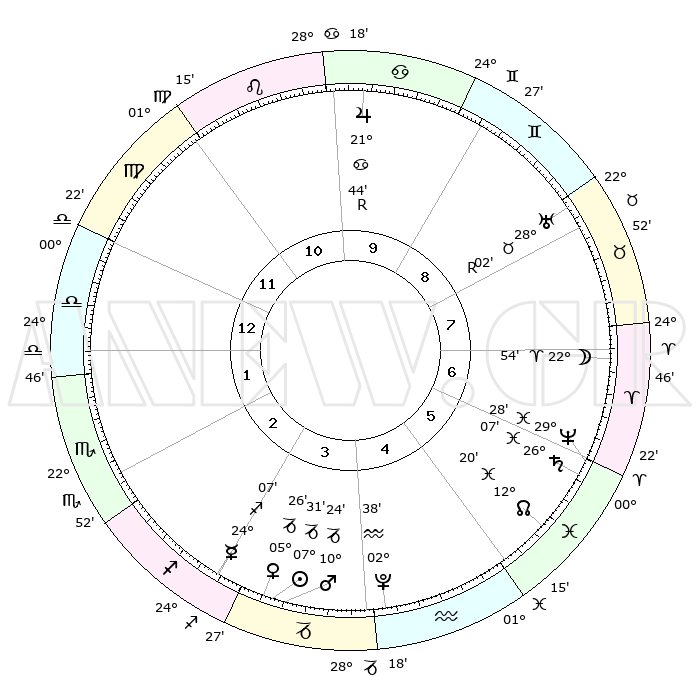 | | ΘΕΣΕΙΣ ΠΛΑΝΗΤΩΝ ΑΣΤΡΟΛΟΓΙΚΟΥ ΧΑΡΤΗ ΤΗΣ ΣΤΙΓΜΗΣ ΑΥΤΗΣ | | | | Πλανήτης | Ζώδιο | Μοίρες | Δεκαήμ. | Σε οίκο | Απόκλιση | | Ακμές των οίκων | | Ηλιος | Αιγόκερως | 07°26' | Πρώτο | 4 | 23 S 13 | | 1ος | 03°57' | Ζυγός | | Σελήνη | Κριός | 21°54' | Τρίτο | 7 | 11 N 36 | | 2ος | 00°49' | Σκορπιός | | Ερμής | Τοξότης | 24°00' | Τρίτο | 3 | 23 S 31 | | 3ος | 01°24' | Τοξότης | | Αφροδίτη | Αιγόκερως | 05°21' | Πρώτο | 4 | 23 S 43 | | 4ος | 04°27' | Αιγόκερως | | Αρης | Αιγόκερως | 10°21' | Δεύτερο | 4 | 23 S 54 | | 5ος | 07°23' | Υδροχόος | | Δίας | Καρκίνος | 21°45'R | Τρίτο | 10 | 21 N 54 | | 6ος | 07°40' | Ιχθείς | | Κρόνος | Ιχθείς | 26°07' | Τρίτο | 6 | 03 S 38 | | 7ος | 03°57' | Κριός | | Ουρανός | Ταύρος | 28°02'R | Τρίτο | 8 | 19 N 31 | | 8ος | 00°49' | Ταύρος | | Ποσειδώνας | Ιχθείς | 29°28' | Τρίτο | 6 | 01 S 26 | | 9ος | 01°24' | Δίδυμοι | | Πλούτωνας | Υδροχόος | 02°38' | Πρώτο | 4 | 23 S 14 | | 10ος | 04°27' | Καρκίνος | | Β. Δεσμός | Ιχθείς | 12°20' | Δεύτερο | 6 | 06 S 56 | | 11ος | 07°23' | Λέων | | Ωροσκόπος | Ζυγός | 03°57' | Πρώτο | | | 12ος | 07°40' | Παρθένος | | Μεσουράνημα | Καρκίνος | 04°27' | Πρώτο | | | |