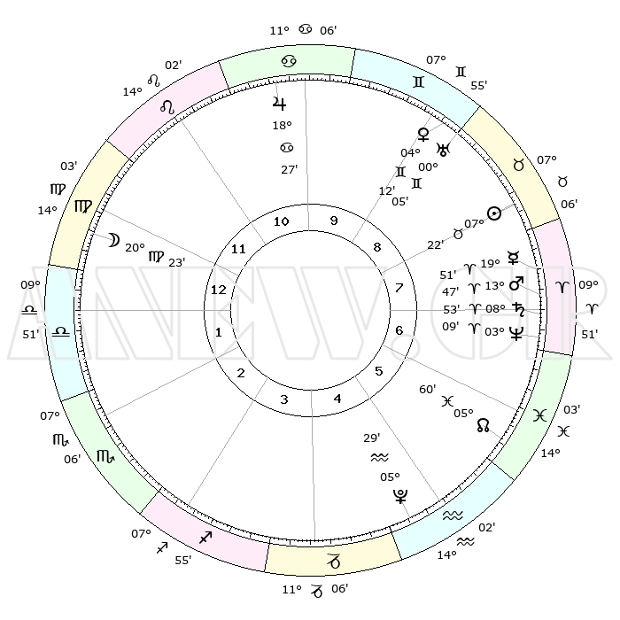 | | ΘΕΣΕΙΣ ΠΛΑΝΗΤΩΝ ΑΣΤΡΟΛΟΓΙΚΟΥ ΧΑΡΤΗ ΤΗΣ ΣΤΙΓΜΗΣ ΑΥΤΗΣ | | | | Πλανήτης | Ζώδιο | Μοίρες | Δεκαήμ. | Σε οίκο | Απόκλιση | | Ακμές των οίκων | | Ηλιος | Ταύρος | 07°18' | Πρώτο | 8 | 13 N 57 | | 1ος | 18°58' | Παρθένος | | Σελήνη | Παρθένος | 19°28' | Δεύτερο | 1 | 03 N 11 | | 2ος | 14°41' | Ζυγός | | Ερμής | Κριός | 19°43' | Δεύτερο | 8 | 05 N 37 | | 3ος | 14°39' | Σκορπιός | | Αφροδίτη | Δίδυμοι | 04°07' | Πρώτο | 9 | 21 N 42 | | 4ος | 17°34' | Τοξότης | | Αρης | Κριός | 13°44' | Δεύτερο | 7 | 04 N 35 | | 5ος | 20°47' | Αιγόκερως | | Δίας | Καρκίνος | 18°27' | Δεύτερο | 10 | 22 N 33 | | 6ος | 21°39' | Υδροχόος | | Κρόνος | Κριός | 08°52' | Πρώτο | 7 | 01 N 31 | | 7ος | 18°58' | Ιχθείς | | Ουρανός | Δίδυμοι | 00°05' | Πρώτο | 9 | 20 N 00 | | 8ος | 14°41' | Κριός | | Ποσειδώνας | Κριός | 03°09' | Πρώτο | 7 | 00 N 03 | | 9ος | 14°39' | Ταύρος | | Πλούτωνας | Υδροχόος | 05°29' | Πρώτο | 5 | 22 S 48 | | 10ος | 17°35' | Δίδυμοι | | Β. Δεσμός | Ιχθείς | 05°60' | Πρώτο | 6 | 09 S 19 | | 11ος | 20°47' | Καρκίνος | | Ωροσκόπος | Παρθένος | 18°58' | Δεύτερο | | | 12ος | 21°39' | Λέων | | Μεσουράνημα | Δίδυμοι | 17°35' | Δεύτερο | | | |