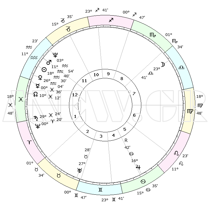 | | ΘΕΣΕΙΣ ΠΛΑΝΗΤΩΝ ΑΣΤΡΟΛΟΓΙΚΟΥ ΧΑΡΤΗ ΤΗΣ ΣΤΙΓΜΗΣ ΑΥΤΗΣ | | | | Πλανήτης | Ζώδιο | Μοίρες | Δεκαήμ. | Σε οίκο | Απόκλιση | | Ακμές των οίκων | | Ηλιος | Υδροχόος | 18°27' | Δεύτερο | 1 | 15 S 18 | | 1ος | 17°28' | Υδροχόος | | Σελήνη | Ζυγός | 22°59' | Τρίτο | 8 | 12 S 19 | | 2ος | 03°14' | Κριός | | Ερμής | Ιχθείς | 00°30' | Πρώτο | 1 | 12 S 31 | | 3ος | 08°28' | Ταύρος | | Αφροδίτη | Υδροχόος | 25°60' | Τρίτο | 1 | 14 S 12 | | 4ος | 04°18' | Δίδυμοι | | Αρης | Υδροχόος | 11°37' | Δεύτερο | 12 | 18 S 19 | | 5ος | 26°11' | Δίδυμοι | | Δίας | Καρκίνος | 16°42'R | Δεύτερο | 5 | 22 N 42 | | 6ος | 18°36' | Καρκίνος | | Κρόνος | Ιχθείς | 29°23' | Τρίτο | 1 | 02 S 14 | | 7ος | 17°28' | Λέων | | Ουρανός | Ταύρος | 27°28' | Τρίτο | 3 | 19 N 24 | | 8ος | 03°14' | Ζυγός | | Ποσειδώνας | Κριός | 00°19' | Πρώτο | 1 | 01 S 05 | | 9ος | 08°28' | Σκορπιός | | Πλούτωνας | Υδροχόος | 03°54' | Πρώτο | 12 | 22 S 59 | | 10ος | 04°18' | Τοξότης | | Β. Δεσμός | Ιχθείς | 10°12' | Δεύτερο | 1 | 07 S 45 | | 11ος | 26°11' | Τοξότης | | Ωροσκόπος | Υδροχόος | 17°28' | Δεύτερο | | | 12ος | 18°36' | Αιγόκερως | | Μεσουράνημα | Τοξότης | 04°18' | Πρώτο | | | |