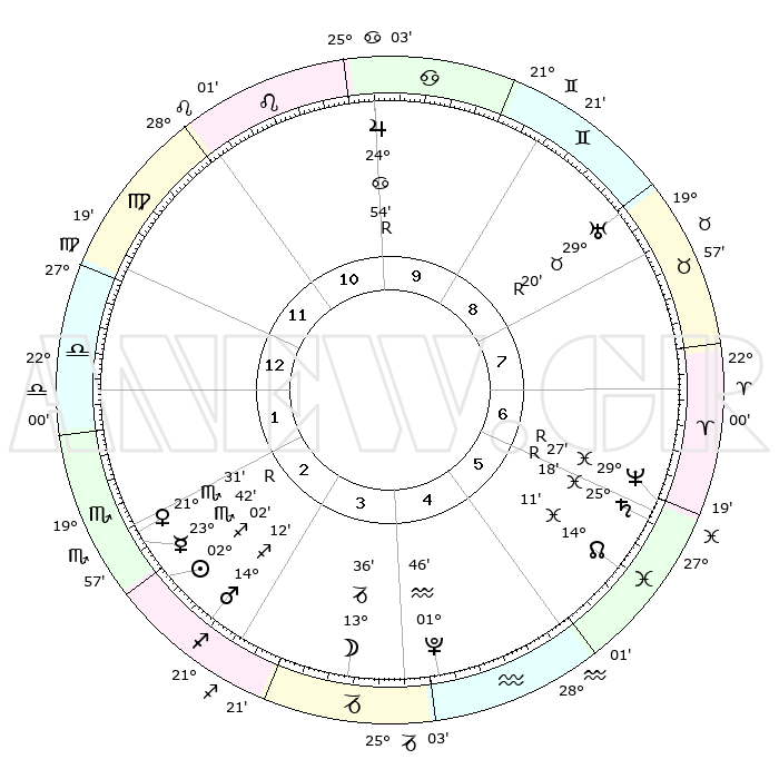 | | ΘΕΣΕΙΣ ΠΛΑΝΗΤΩΝ ΑΣΤΡΟΛΟΓΙΚΟΥ ΧΑΡΤΗ ΤΗΣ ΣΤΙΓΜΗΣ ΑΥΤΗΣ | | | | Πλανήτης | Ζώδιο | Μοίρες | Δεκαήμ. | Σε οίκο | Απόκλιση | | Ακμές των οίκων | | Ηλιος | Τοξότης | 02°02' | Πρώτο | 2 | 20 S 34 | | 1ος | 18°45' | Ζυγός | | Σελήνη | Αιγόκερως | 13°28' | Δεύτερο | 3 | 27 S 07 | | 2ος | 16°31' | Σκορπιός | | Ερμής | Σκορπιός | 23°43'R | Τρίτο | 2 | 17 S 05 | | 3ος | 17°44' | Τοξότης | | Αφροδίτη | Σκορπιός | 21°30' | Τρίτο | 2 | 17 S 13 | | 4ος | 21°16' | Αιγόκερως | | Αρης | Τοξότης | 14°11' | Δεύτερο | 2 | 23 S 06 | | 5ος | 24°13' | Υδροχόος | | Δίας | Καρκίνος | 24°54'R | Τρίτο | 10 | 21 N 17 | | 6ος | 23°45' | Ιχθείς | | Κρόνος | Ιχθείς | 25°18'R | Τρίτο | 6 | 04 S 04 | | 7ος | 18°45' | Κριός | | Ουρανός | Ταύρος | 29°20'R | Τρίτο | 8 | 19 N 48 | | 8ος | 16°31' | Ταύρος | | Ποσειδώνας | Ιχθείς | 29°27'R | Τρίτο | 6 | 01 S 28 | | 9ος | 17°44' | Δίδυμοι | | Πλούτωνας | Υδροχόος | 01°46' | Πρώτο | 4 | 23 S 26 | | 10ος | 21°16' | Καρκίνος | | Β. Δεσμός | Ιχθείς | 14°11' | Δεύτερο | 5 | 06 S 14 | | 11ος | 24°13' | Λέων | | Ωροσκόπος | Ζυγός | 18°45' | Δεύτερο | | | 12ος | 23°45' | Παρθένος | | Μεσουράνημα | Καρκίνος | 21°16' | Τρίτο | | | |
