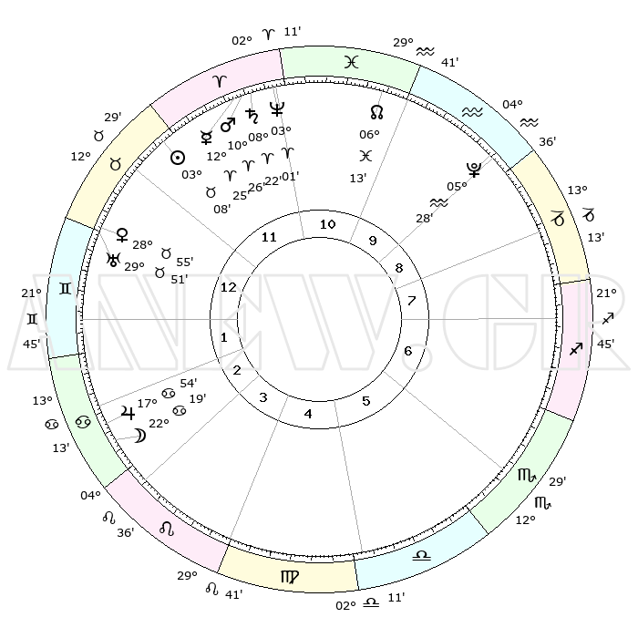 | | ΘΕΣΕΙΣ ΠΛΑΝΗΤΩΝ ΑΣΤΡΟΛΟΓΙΚΟΥ ΧΑΡΤΗ ΤΗΣ ΣΤΙΓΜΗΣ ΑΥΤΗΣ | | | | Πλανήτης | Ζώδιο | Μοίρες | Δεκαήμ. | Σε οίκο | Απόκλιση | | Ακμές των οίκων | | Ηλιος | Ταύρος | 03°04' | Πρώτο | 12 | 12 N 32 | | 1ος | 26°46' | Ταύρος | | Σελήνη | Καρκίνος | 21°25' | Τρίτο | 3 | 25 N 21 | | 2ος | 22°15' | Δίδυμοι | | Ερμής | Κριός | 12°19' | Δεύτερο | 12 | 02 N 32 | | 3ος | 13°48' | Καρκίνος | | Αφροδίτη | Ταύρος | 28°50' | Τρίτο | 1 | 20 N 26 | | 4ος | 06°20' | Λέων | | Αρης | Κριός | 10°23' | Δεύτερο | 11 | 03 N 15 | | 5ος | 04°15' | Παρθένος | | Δίας | Καρκίνος | 17°54' | Δεύτερο | 3 | 22 N 37 | | 6ος | 12°10' | Ζυγός | | Κρόνος | Κριός | 08°22' | Πρώτο | 11 | 01 N 20 | | 7ος | 26°46' | Σκορπιός | | Ουρανός | Ταύρος | 29°51' | Τρίτο | 1 | 19 N 57 | | 8ος | 22°15' | Τοξότης | | Ποσειδώνας | Κριός | 03°01' | Πρώτο | 11 | 00 S 01 | | 9ος | 13°48' | Αιγόκερως | | Πλούτωνας | Υδροχόος | 05°28' | Πρώτο | 9 | 22 S 48 | | 10ος | 06°20' | Υδροχόος | | Β. Δεσμός | Ιχθείς | 06°14' | Πρώτο | 11 | 09 S 13 | | 11ος | 04°15' | Ιχθείς | | Ωροσκόπος | Ταύρος | 26°46' | Τρίτο | | | 12ος | 12°10' | Κριός | | Μεσουράνημα | Υδροχόος | 06°20' | Πρώτο | | | |