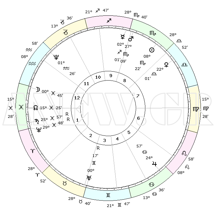 |  | ΘΕΣΕΙΣ ΠΛΑΝΗΤΩΝ ΑΣΤΡΟΛΟΓΙΚΟΥ ΧΑΡΤΗ ΤΗΣ ΣΤΙΓΜΗΣ ΑΥΤΗΣ |  |  |  | | Πλανήτης | Ζώδιο | Μοίρες | Δεκαήμ. | Σε οίκο | Απόκλιση |  | Ακμές των οίκων |  | Ηλιος | Σκορπιός | 08°07' | Πρώτο | 11 | 14 S 13 |  | 1ος | 06°24' | Τοξότης |  | Σελήνη | Υδροχόος | 27°28' | Τρίτο | 3 | 13 S 58 |  | 2ος | 08°30' | Αιγόκερως |  | Ερμής | Τοξότης | 01°48' | Πρώτο | 12 | 23 S 21 |  | 3ος | 15°16' | Υδροχόος |  | Αφροδίτη | Ζυγός | 21°42' | Τρίτο | 11 | 07 S 05 |  | 4ος | 21°21' | Ιχθείς |  | Αρης | Σκορπιός | 26°59' | Τρίτο | 12 | 19 S 51 |  | 5ος | 21°31' | Κριός |  | Δίας | Καρκίνος | 24°56' | Τρίτο | 8 | 21 N 13 |  | 6ος | 15°43' | Ταύρος |  | Κρόνος | Ιχθείς | 25°57'R | Τρίτο | 4 | 03 S 52 |  | 7ος | 06°24' | Δίδυμοι |  | Ουρανός | Δίδυμοι | 00°18'R | Πρώτο | 6 | 20 N 00 |  | 8ος | 08°30' | Καρκίνος |  | Ποσειδώνας | Ιχθείς | 29°48'R | Τρίτο | 4 | 01 S 20 |  | 9ος | 15°17' | Λέων |  | Πλούτωνας | Υδροχόος | 01°26' | Πρώτο | 2 | 23 S 31 |  | 10ος | 21°21' | Παρθένος |  | Β. Δεσμός | Ιχθείς | 15°26' | Δεύτερο | 3 | 05 S 44 |  | 11ος | 21°31' | Ζυγός |  | Ωροσκόπος | Τοξότης | 06°24' | Πρώτο |  |  | 12ος | 15°43' | Σκορπιός |  | Μεσουράνημα | Παρθένος | 21°21' | Τρίτο |  |  |  |