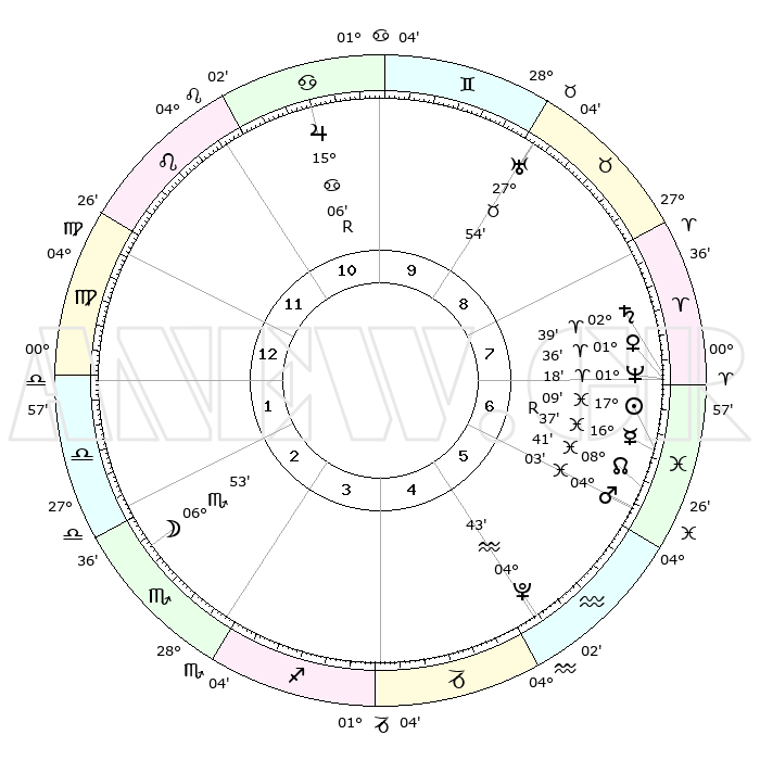 | | ΘΕΣΕΙΣ ΠΛΑΝΗΤΩΝ ΑΣΤΡΟΛΟΓΙΚΟΥ ΧΑΡΤΗ ΤΗΣ ΣΤΙΓΜΗΣ ΑΥΤΗΣ | | | | Πλανήτης | Ζώδιο | Μοίρες | Δεκαήμ. | Σε οίκο | Απόκλιση | | Ακμές των οίκων | | Ηλιος | Ιχθείς | 17°06' | Δεύτερο | 7 | 05 S 06 | | 1ος | 16°00' | Παρθένος | | Σελήνη | Σκορπιός | 06°15' | Πρώτο | 2 | 17 S 47 | | 2ος | 11°27' | Ζυγός | | Ερμής | Ιχθείς | 16°40'R | Δεύτερο | 7 | 01 S 55 | | 3ος | 11°16' | Σκορπιός | | Αφροδίτη | Κριός | 01°32' | Πρώτο | 7 | 00 S 31 | | 4ος | 14°12' | Τοξότης | | Αρης | Ιχθείς | 04°01' | Πρώτο | 6 | 11 S 03 | | 5ος | 17°31' | Αιγόκερως | | Δίας | Καρκίνος | 15°06'R | Δεύτερο | 10 | 22 N 56 | | 6ος | 18°31' | Υδροχόος | | Κρόνος | Κριός | 02°39' | Πρώτο | 7 | 00 S 54 | | 7ος | 16°00' | Ιχθείς | | Ουρανός | Ταύρος | 27°54' | Τρίτο | 9 | 19 N 31 | | 8ος | 11°27' | Κριός | | Ποσειδώνας | Κριός | 01°18' | Πρώτο | 7 | 00 S 41 | | 9ος | 11°16' | Ταύρος | | Πλούτωνας | Υδροχόος | 04°43' | Πρώτο | 5 | 22 S 51 | | 10ος | 14°12' | Δίδυμοι | | Β. Δεσμός | Ιχθείς | 08°41' | Πρώτο | 6 | 08 S 19 | | 11ος | 17°31' | Καρκίνος | | Ωροσκόπος | Παρθένος | 16°00' | Δεύτερο | | | 12ος | 18°31' | Λέων | | Μεσουράνημα | Δίδυμοι | 14°12' | Δεύτερο | | | |