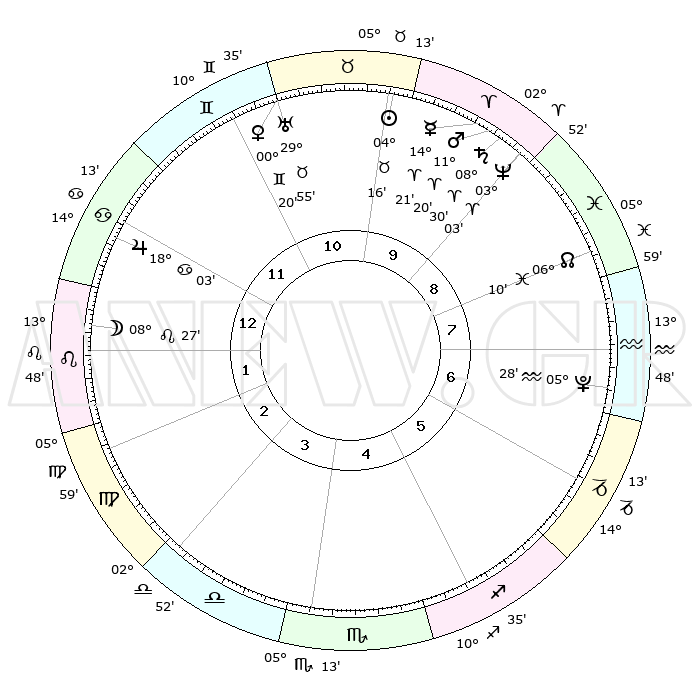 | | ΘΕΣΕΙΣ ΠΛΑΝΗΤΩΝ ΑΣΤΡΟΛΟΓΙΚΟΥ ΧΑΡΤΗ ΤΗΣ ΣΤΙΓΜΗΣ ΑΥΤΗΣ | | | | Πλανήτης | Ζώδιο | Μοίρες | Δεκαήμ. | Σε οίκο | Απόκλιση | | Ακμές των οίκων | | Ηλιος | Ταύρος | 04°12' | Πρώτο | 10 | 12 N 55 | | 1ος | 24°34' | Καρκίνος | | Σελήνη | Λέων | 07°33' | Πρώτο | 1 | 20 N 50 | | 2ος | 15°18' | Λέων | | Ερμής | Κριός | 14°15' | Δεύτερο | 10 | 03 N 20 | | 3ος | 09°37' | Παρθένος | | Αφροδίτη | Δίδυμοι | 00°15' | Πρώτο | 11 | 20 N 47 | | 4ος | 09°55' | Ζυγός | | Αρης | Κριός | 11°17' | Δεύτερο | 10 | 03 N 36 | | 5ος | 16°00' | Σκορπιός | | Δίας | Καρκίνος | 18°02' | Δεύτερο | 12 | 22 N 36 | | 6ος | 22°38' | Τοξότης | | Κρόνος | Κριός | 08°30' | Πρώτο | 9 | 01 N 23 | | 7ος | 24°34' | Αιγόκερως | | Ουρανός | Ταύρος | 29°55' | Τρίτο | 11 | 19 N 58 | | 8ος | 15°18' | Υδροχόος | | Ποσειδώνας | Κριός | 03°03' | Πρώτο | 9 | 00 N 00 | | 9ος | 09°37' | Ιχθείς | | Πλούτωνας | Υδροχόος | 05°28' | Πρώτο | 7 | 22 S 48 | | 10ος | 09°55' | Κριός | | Β. Δεσμός | Ιχθείς | 06°10' | Πρώτο | 8 | 09 S 15 | | 11ος | 16°00' | Ταύρος | | Ωροσκόπος | Καρκίνος | 24°34' | Τρίτο | | | 12ος | 22°38' | Δίδυμοι | | Μεσουράνημα | Κριός | 09°55' | Πρώτο | | | |