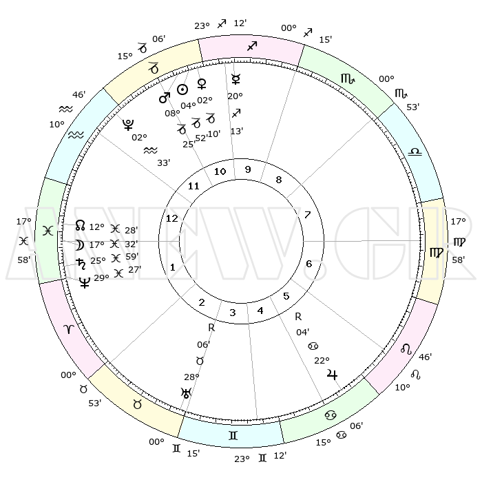 | | ΘΕΣΕΙΣ ΠΛΑΝΗΤΩΝ ΑΣΤΡΟΛΟΓΙΚΟΥ ΧΑΡΤΗ ΤΗΣ ΣΤΙΓΜΗΣ ΑΥΤΗΣ | | | | Πλανήτης | Ζώδιο | Μοίρες | Δεκαήμ. | Σε οίκο | Απόκλιση | | Ακμές των οίκων | | Ηλιος | Αιγόκερως | 04°47' | Πρώτο | 11 | 23 S 21 | | 1ος | 06°55' | Υδροχόος | | Σελήνη | Ιχθείς | 16°31' | Δεύτερο | 1 | 04 S 54 | | 2ος | 21°59' | Ιχθείς | | Ερμής | Τοξότης | 20°06' | Τρίτο | 11 | 22 S 58 | | 3ος | 29°15' | Κριός | | Αφροδίτη | Αιγόκερως | 02°04' | Πρώτο | 11 | 23 S 42 | | 4ος | 26°35' | Ταύρος | | Αρης | Αιγόκερως | 08°21' | Πρώτο | 11 | 24 S 01 | | 5ος | 18°54' | Δίδυμοι | | Δίας | Καρκίνος | 22°05'R | Τρίτο | 6 | 21 N 51 | | 6ος | 10°38' | Καρκίνος | | Κρόνος | Ιχθείς | 25°59' | Τρίτο | 2 | 03 S 41 | | 7ος | 06°55' | Λέων | | Ουρανός | Ταύρος | 28°07'R | Τρίτο | 4 | 19 N 32 | | 8ος | 21°59' | Παρθένος | | Ποσειδώνας | Ιχθείς | 29°27' | Τρίτο | 2 | 01 S 27 | | 9ος | 29°15' | Ζυγός | | Πλούτωνας | Υδροχόος | 02°33' | Πρώτο | 12 | 23 S 15 | | 10ος | 26°35' | Σκορπιός | | Β. Δεσμός | Ιχθείς | 12°28' | Δεύτερο | 1 | 06 S 53 | | 11ος | 18°54' | Τοξότης | | Ωροσκόπος | Υδροχόος | 06°55' | Πρώτο | | | 12ος | 10°38' | Αιγόκερως | | Μεσουράνημα | Σκορπιός | 26°35' | Τρίτο | | | |