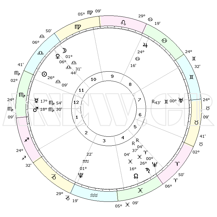 | ΘΕΣΕΙΣ ΠΛΑΝΗΤΩΝ ΑΣΤΡΟΛΟΓΙΚΟΥ ΧΑΡΤΗ ΤΗΣ ΣΤΙΓΜΗΣ ΑΥΤΗΣ | | Πλανήτης | Ζώδιο | Μοίρες | Δεκαήμ. | Σε οίκο | Απόκλιση | | Ακμές των οίκων | Ηλιος | Ζυγός | 25°51' | Τρίτο | 3 | 09 S 59 | | 1ος | 23°13' | Λέων | Σελήνη | Παρθένος | 27°43' | Τρίτο | 2 | 00 N 06 | | 2ος | 16°21' | Παρθένος | Ερμής | Σκορπιός | 17°29' | Δεύτερο | 4 | 19 S 05 | | 3ος | 14°21' | Ζυγός | Αφροδίτη | Ζυγός | 06°20' | Πρώτο | 2 | 01 S 06 | | 4ος | 17°08' | Σκορπιός | Αρης | Σκορπιός | 18°17' | Δεύτερο | 4 | 17 S 31 | | 5ος | 21°48' | Τοξότης | Δίας | Καρκίνος | 24°15' | Τρίτο | 11 | 21 N 19 | | 6ος | 24°22' | Αιγόκερως | Κρόνος | Ιχθείς | 26°38'R | Τρίτο | 8 | 03 S 38 | | 7ος | 23°13' | Υδροχόος | Ουρανός | Δίδυμοι | 00°44'R | Πρώτο | 10 | 20 N 06 | | 8ος | 16°21' | Ιχθείς | Ποσειδώνας | Κριός | 00°05'R | Πρώτο | 8 | 01 S 14 | | 9ος | 14°21' | Κριός | Πλούτωνας | Υδροχόος | 01°22' | Πρώτο | 6 | 23 S 32 | | 10ος | 17°08' | Ταύρος | Β. Δεσμός | Ιχθείς | 16°05' | Δεύτερο | 7 | 05 S 29 | | 11ος | 21°48' | Δίδυμοι | Ωροσκόπος | Λέων | 23°13' | Τρίτο | | | 12ος | 24°22' | Καρκίνος | Μεσουράνημα | Ταύρος | 17°08' | Δεύτερο | | | |