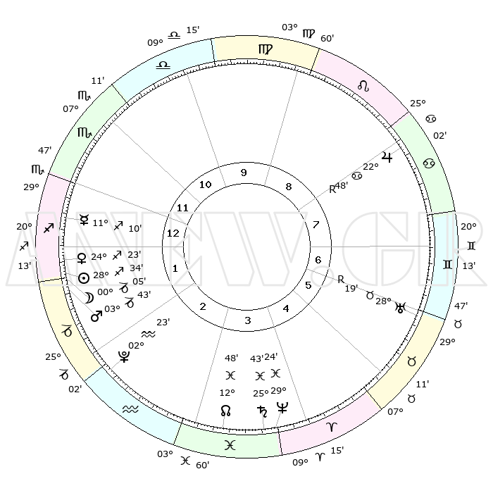 | | ΘΕΣΕΙΣ ΠΛΑΝΗΤΩΝ ΑΣΤΡΟΛΟΓΙΚΟΥ ΧΑΡΤΗ ΤΗΣ ΣΤΙΓΜΗΣ ΑΥΤΗΣ | | | | Πλανήτης | Ζώδιο | Μοίρες | Δεκαήμ. | Σε οίκο | Απόκλιση | | Ακμές των οίκων | | Ηλιος | Τοξότης | 28°30' | Τρίτο | 1 | 23 S 25 | | 1ος | 01°12' | Τοξότης | | Σελήνη | Τοξότης | 29°19' | Τρίτο | 1 | 28 S 13 | | 2ος | 02°29' | Αιγόκερως | | Ερμής | Τοξότης | 11°04' | Δεύτερο | 1 | 21 S 14 | | 3ος | 08°24' | Υδροχόος | | Αφροδίτη | Τοξότης | 24°18' | Τρίτο | 1 | 23 S 21 | | 4ος | 14°28' | Ιχθείς | | Αρης | Αιγόκερως | 03°40' | Πρώτο | 2 | 24 S 12 | | 5ος | 15°21' | Κριός | | Δίας | Καρκίνος | 22°49'R | Τρίτο | 8 | 21 N 43 | | 6ος | 10°14' | Ταύρος | | Κρόνος | Ιχθείς | 25°43' | Τρίτο | 4 | 03 S 49 | | 7ος | 01°12' | Δίδυμοι | | Ουρανός | Ταύρος | 28°19'R | Τρίτο | 6 | 19 N 35 | | 8ος | 02°29' | Καρκίνος | | Ποσειδώνας | Ιχθείς | 29°24' | Τρίτο | 4 | 01 S 28 | | 9ος | 08°24' | Λέων | | Πλούτωνας | Υδροχόος | 02°23' | Πρώτο | 2 | 23 S 18 | | 10ος | 14°28' | Παρθένος | | Β. Δεσμός | Ιχθείς | 12°48' | Δεύτερο | 3 | 06 S 45 | | 11ος | 15°21' | Ζυγός | | Ωροσκόπος | Τοξότης | 01°12' | Πρώτο | | | 12ος | 10°14' | Σκορπιός | | Μεσουράνημα | Παρθένος | 14°28' | Δεύτερο | | | |