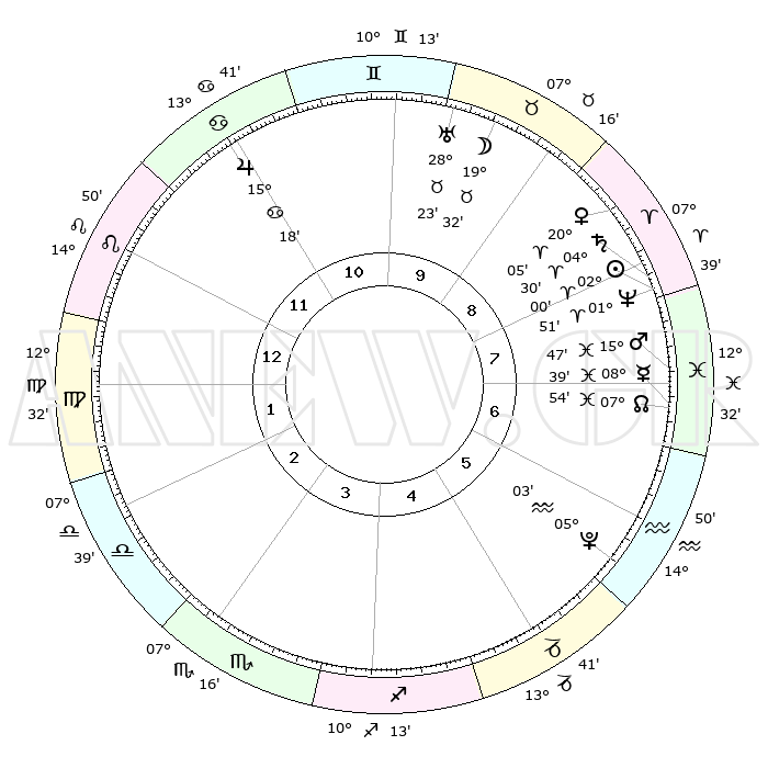 | | ΘΕΣΕΙΣ ΠΛΑΝΗΤΩΝ ΑΣΤΡΟΛΟΓΙΚΟΥ ΧΑΡΤΗ ΤΗΣ ΣΤΙΓΜΗΣ ΑΥΤΗΣ | | | | Πλανήτης | Ζώδιο | Μοίρες | Δεκαήμ. | Σε οίκο | Απόκλιση | | Ακμές των οίκων | | Ηλιος | Κριός | 01°56' | Πρώτο | 8 | 00 N 46 | | 1ος | 23°18' | Λέων | | Σελήνη | Ταύρος | 18°35' | Δεύτερο | 10 | 22 N 04 | | 2ος | 16°27' | Παρθένος | | Ερμής | Ιχθείς | 08°39' | Πρώτο | 7 | 07 S 48 | | 3ος | 14°27' | Ζυγός | | Αφροδίτη | Κριός | 20°00' | Τρίτο | 9 | 07 N 04 | | 4ος | 17°14' | Σκορπιός | | Αρης | Ιχθείς | 15°44' | Δεύτερο | 7 | 06 S 37 | | 5ος | 21°54' | Τοξότης | | Δίας | Καρκίνος | 15°18' | Δεύτερο | 11 | 22 N 55 | | 6ος | 24°27' | Αιγόκερως | | Κρόνος | Κριός | 04°29' | Πρώτο | 8 | 00 S 10 | | 7ος | 23°18' | Υδροχόος | | Ουρανός | Ταύρος | 28°23' | Τρίτο | 10 | 19 N 37 | | 8ος | 16°27' | Ιχθείς | | Ποσειδώνας | Κριός | 01°51' | Πρώτο | 8 | 00 S 28 | | 9ος | 14°27' | Κριός | | Πλούτωνας | Υδροχόος | 05°03' | Πρώτο | 6 | 22 S 48 | | 10ος | 17°14' | Ταύρος | | Β. Δεσμός | Ιχθείς | 07°54' | Πρώτο | 7 | 08 S 36 | | 11ος | 21°54' | Δίδυμοι | | Ωροσκόπος | Λέων | 23°18' | Τρίτο | | | 12ος | 24°27' | Καρκίνος | | Μεσουράνημα | Ταύρος | 17°14' | Δεύτερο | | | |