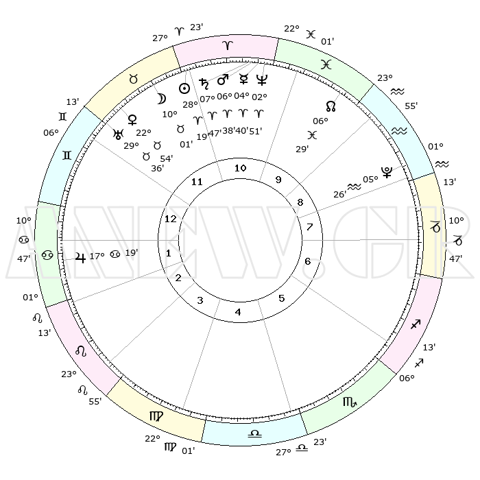 | | ΘΕΣΕΙΣ ΠΛΑΝΗΤΩΝ ΑΣΤΡΟΛΟΓΙΚΟΥ ΧΑΡΤΗ ΤΗΣ ΣΤΙΓΜΗΣ ΑΥΤΗΣ | | | | Πλανήτης | Ζώδιο | Μοίρες | Δεκαήμ. | Σε οίκο | Απόκλιση | | Ακμές των οίκων | | Ηλιος | Κριός | 28°15' | Τρίτο | 11 | 10 N 51 | | 1ος | 18°22' | Δίδυμοι | | Σελήνη | Ταύρος | 09°01' | Πρώτο | 12 | 18 N 44 | | 2ος | 10°12' | Καρκίνος | | Ερμής | Κριός | 04°34' | Πρώτο | 11 | 00 S 36 | | 3ος | 01°29' | Λέων | | Αφροδίτη | Ταύρος | 22°50' | Τρίτο | 12 | 18 N 47 | | 4ος | 26°07' | Λέων | | Αρης | Κριός | 06°35' | Πρώτο | 11 | 01 N 43 | | 5ος | 27°59' | Παρθένος | | Δίας | Καρκίνος | 17°19' | Δεύτερο | 2 | 22 N 41 | | 6ος | 08°14' | Σκορπιός | | Κρόνος | Κριός | 07°47' | Πρώτο | 11 | 01 N 07 | | 7ος | 18°22' | Τοξότης | | Ουρανός | Ταύρος | 29°35' | Τρίτο | 12 | 19 N 54 | | 8ος | 10°12' | Αιγόκερως | | Ποσειδώνας | Κριός | 02°50' | Πρώτο | 11 | 00 S 05 | | 9ος | 01°29' | Υδροχόος | | Πλούτωνας | Υδροχόος | 05°26' | Πρώτο | 9 | 22 S 47 | | 10ος | 26°07' | Υδροχόος | | Β. Δεσμός | Ιχθείς | 06°29' | Πρώτο | 10 | 09 S 08 | | 11ος | 27°59' | Ιχθείς | | Ωροσκόπος | Δίδυμοι | 18°22' | Δεύτερο | | | 12ος | 08°14' | Ταύρος | | Μεσουράνημα | Υδροχόος | 26°07' | Τρίτο | | | |