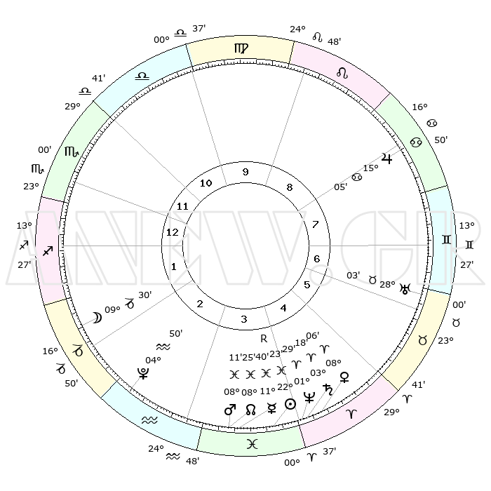 | | ΘΕΣΕΙΣ ΠΛΑΝΗΤΩΝ ΑΣΤΡΟΛΟΓΙΚΟΥ ΧΑΡΤΗ ΤΗΣ ΣΤΙΓΜΗΣ ΑΥΤΗΣ | | | | Πλανήτης | Ζώδιο | Μοίρες | Δεκαήμ. | Σε οίκο | Απόκλιση | | Ακμές των οίκων | | Ηλιος | Ιχθείς | 22°20' | Τρίτο | 4 | 03 S 02 | | 1ος | 28°37' | Σκορπιός | | Σελήνη | Αιγόκερως | 08°53' | Πρώτο | 2 | 27 S 42 | | 2ος | 29°34' | Τοξότης | | Ερμής | Ιχθείς | 11°42'R | Δεύτερο | 4 | 04 S 31 | | 3ος | 05°03' | Υδροχόος | | Αφροδίτη | Κριός | 08°03' | Πρώτο | 4 | 02 N 10 | | 4ος | 11°03' | Ιχθείς | | Αρης | Ιχθείς | 08°08' | Πρώτο | 3 | 09 S 32 | | 5ος | 12°15' | Κριός | | Δίας | Καρκίνος | 15°05' | Δεύτερο | 8 | 22 N 56 | | 6ος | 07°29' | Ταύρος | | Κρόνος | Κριός | 03°17' | Πρώτο | 4 | 00 S 39 | | 7ος | 28°37' | Ταύρος | | Ουρανός | Ταύρος | 28°03' | Τρίτο | 6 | 19 N 33 | | 8ος | 29°34' | Δίδυμοι | | Ποσειδώνας | Κριός | 01°29' | Πρώτο | 4 | 00 S 36 | | 9ος | 05°03' | Λέων | | Πλούτωνας | Υδροχόος | 04°50' | Πρώτο | 2 | 22 S 50 | | 10ος | 11°03' | Παρθένος | | Β. Δεσμός | Ιχθείς | 08°25' | Πρώτο | 3 | 08 S 25 | | 11ος | 12°15' | Ζυγός | | Ωροσκόπος | Σκορπιός | 28°37' | Τρίτο | | | 12ος | 07°29' | Σκορπιός | | Μεσουράνημα | Παρθένος | 11°03' | Δεύτερο | | | |