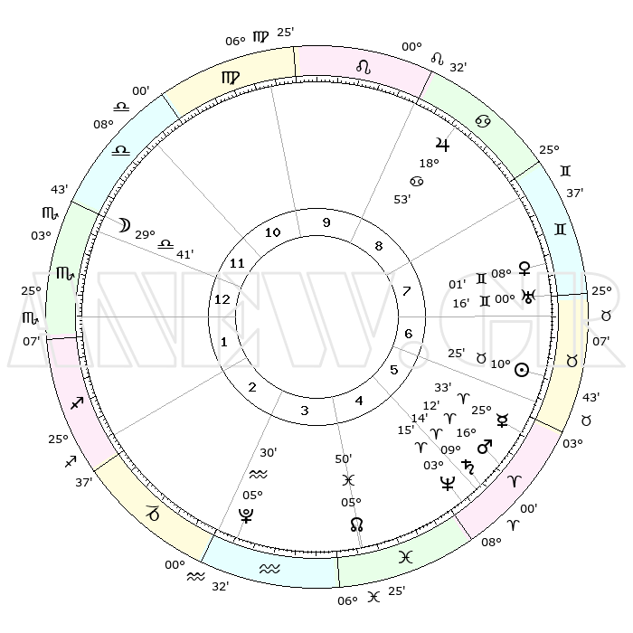 | | ΘΕΣΕΙΣ ΠΛΑΝΗΤΩΝ ΑΣΤΡΟΛΟΓΙΚΟΥ ΧΑΡΤΗ ΤΗΣ ΣΤΙΓΜΗΣ ΑΥΤΗΣ | | | | Πλανήτης | Ζώδιο | Μοίρες | Δεκαήμ. | Σε οίκο | Απόκλιση | | Ακμές των οίκων | | Ηλιος | Ταύρος | 10°23' | Δεύτερο | 6 | 14 N 56 | | 1ος | 12°14' | Σκορπιός | | Σελήνη | Ζυγός | 29°08' | Τρίτο | 12 | 14 S 54 | | 2ος | 11°29' | Τοξότης | | Ερμής | Κριός | 25°28' | Τρίτο | 6 | 08 N 02 | | 3ος | 14°38' | Αιγόκερως | | Αφροδίτη | Δίδυμοι | 07°58' | Πρώτο | 7 | 22 N 30 | | 4ος | 19°43' | Υδροχόος | | Αρης | Κριός | 16°10' | Δεύτερο | 5 | 05 N 32 | | 5ος | 22°17' | Ιχθείς | | Δίας | Καρκίνος | 18°53' | Δεύτερο | 9 | 22 N 29 | | 6ος | 19°40' | Κριός | | Κρόνος | Κριός | 09°14' | Πρώτο | 5 | 01 N 40 | | 7ος | 12°14' | Ταύρος | | Ουρανός | Δίδυμοι | 00°16' | Πρώτο | 7 | 20 N 02 | | 8ος | 11°29' | Δίδυμοι | | Ποσειδώνας | Κριός | 03°15' | Πρώτο | 5 | 00 N 05 | | 9ος | 14°38' | Καρκίνος | | Πλούτωνας | Υδροχόος | 05°30' | Πρώτο | 3 | 22 S 49 | | 10ος | 19°43' | Λέων | | Β. Δεσμός | Ιχθείς | 05°50' | Πρώτο | 4 | 09 S 22 | | 11ος | 22°17' | Παρθένος | | Ωροσκόπος | Σκορπιός | 12°14' | Δεύτερο | | | 12ος | 19°40' | Ζυγός | | Μεσουράνημα | Λέων | 19°43' | Δεύτερο | | | |